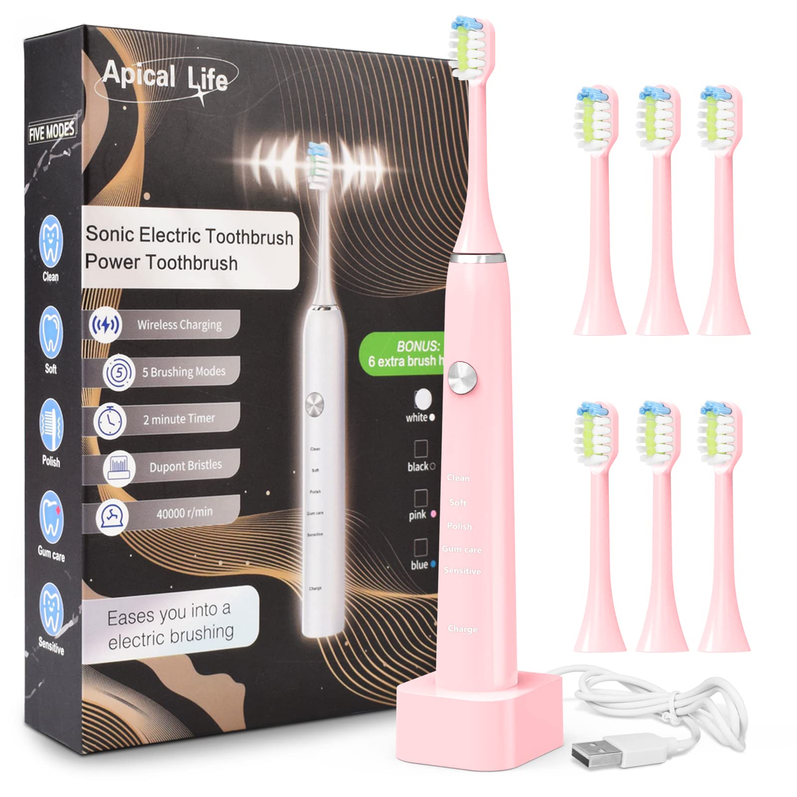 A GOOD GIFT FOR ADULTS- Electric toothbrush set there are four color combinations, white, black, pink, blue, suitable for most groups, perfect for your loved ones, friends or parents, together to love oral health. DUPONT BRISTLE BRUSH WITH DISCOLORATION REMINDER - medium hardness DuPont bristle brush with W-shaped bristles that fit the shape of your teeth, effectively cleaning all corners of your teeth and keeping your mouth clean. There are six attached toothbrush head, can be replaced throughout the year. 5 CLEANING MODES-There are clean, soft, polish, gum care, sensitive, five to choose from, a variety of ways to clean your teeth, all aspects of keeping your teeth clean, intelligent vibration notification timer, 2 minutes full time and every 30 seconds interval to remind you to move to the next oral quadrant, Apical Life Sonic Toothbrush makes it easy to develop good brushing habits, start taking care of your oral health. FAST CHARGING NO NEED TO WAIT LONG- Wireless charging,just charge 4-6h, can be used for 35 days, wireless fast charging makes it more convenient for you to use at home or go out,; IPX7 waterproof level, the bathroom can also be used safely, making life easier. DEEP CARE FOR YOUR DENTAL HEALTH - With high speed sonic motor technology, the sonic electric toothbrush delivers up to 40,000 powerful strokes per minute by vibrating and the soft Dupont nylon toothbrush pushes the liquid deep between your teeth and gums to deeply clean your teeth and effectively remove receding plaque, coffee stains, tea stains and more. Get a confident smile again.Best Sellers Rank: See Top 100 in Health & Household. Bristle Material: Nylon. Included Components: Battery, Charger. Unit Count: 1.00 Count. Number of Items: 1. Color: Pink. Item Firmness Description: Medium, Soft. Power Source: Battery Powered. Special Feature: Brushing Timer. Age Range (Description): Adult. Brand: Apical Life. : B0BNHLJC6N. Manufacturer: Apical Life. Date First Available: November 28, 2022. Batteries: 1 AAA batteries required. (included). Item model number: ET03. Package Dimensions: 7.24 x 5 x 1.42 inches; 10.23 Ounces.