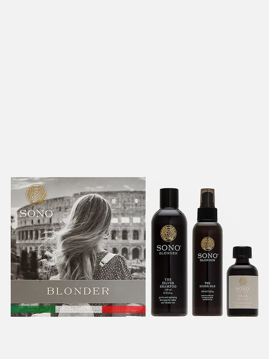 В подарочный набор для ухода за осветленными волосами SONO BLONDER входят шампунь для волос The Silver Shampoo (250 мл), масло для волос The Oil (30 мл) и несмываемый уход для волос The Silver Silk (150 мл).