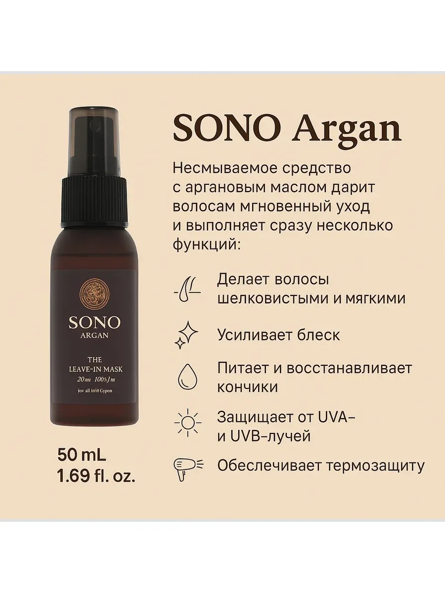 Изысканный аромат, характерный для линии SONO с аргановым маслом, сохраняется на волосах, которые выглядят более здоровыми и ухоженными. Продукт не требует смывания.