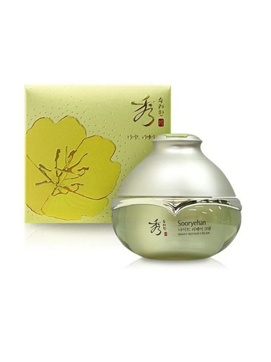 Sooryehan Night Repair Cream is a nighttime repair cream containing the patented Yulyong Active Stage formula, providing a complete and smooth skin result. The cream soothes irritated skin, restores the microbiome, actively moisturizes, and imparts a beautiful glow, helping to calm irritation. It protects against dehydration, intensely nourishes, and promotes a feeling of comfort. It has antioxidant and antibacterial properties and normalizes the hydrolipidic balance. Squalane protects the skin from moisture loss, regulates skin respiration, slows premature aging, and reduces the negative impact of external factors. Wild ginseng root extract intensely nourishes, promotes skin restoration, protects against dehydration, and enhances microcirculation. It also tones, stimulates regeneration, and strengthens the epidermal matrix. Niacinamide eliminates dryness, tightness, and flaking. Slows down the delivery of melanin to the epidermis, eliminating age spots, redness, and post-acne marks. Reduces sensitivity to external irritants. Fermented extracts possess powerful restorative, reparative, and protective properties. Smoothes wrinkles, evens out skin texture, and strengthens the protective barrier. Lightens pigmentation and improves skin tone.