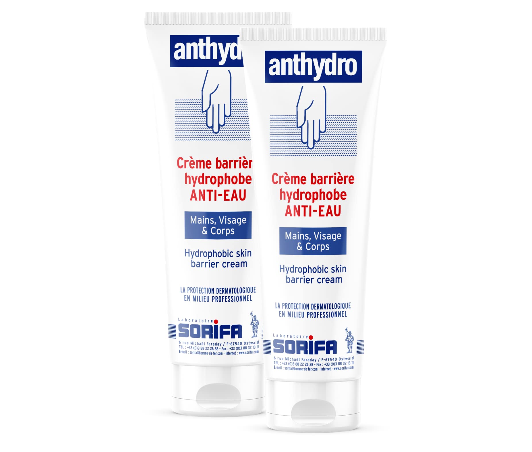 Anthydro is a hydrophobic anti-water barrier cream that treats reactive skin or frequent contact with water and aqueous solutions, cleansers, sols and water-borne substances such as soluble oils. Anthydro contains silicones that protect the skin against repeated contact with water and solutions due to their hydrophobic effect. Anthydro protects the skin against skin irritations caused by friction and prevents its occurrence. Anthydro forms a soft, non-occlusive screen protector while maintaining touch sensitivity. The slightly acidic pH value makes it possible to maintain the integrity and natural protective role of the skin. The highly tolerated formula is low in fat and perfume-free. Can be used for hands, face and body. Made in France under pharmaceutical control. INGREDIENTS Aqua, propylene glycol dicaprylate dicaprates, stearalconium hectorite, propylene carbonate, isostearyl diglyceryl succinate, dimethicone, octyldodecanol, propylene glycol, magnesium sulphates, benzyl alcohol, potassium sorbate, sodium benzoate, citric acid. INSTRUCTIONS FOR USE Apply to clean and dry skin. Distribute well over the desired area by laying on the folds. Renew use regularly or when washing. SAFETY WARNING For external use only. See moreWater resistant. Non-stick coating. High tolerability formula, perfume-free. For hands, face and body. Made in France under pharmaceutical control. Protection against water and explosions.2 stuks - Anthydro - barrièrecrème - waterbescherming - anti-smurf - handen, gezicht en lichaam - hoge verdraagzaamheid - parfumvrij - tube 125 ml Anthydro is een hydrofobe anti-waterbarrièrecrème die reactieve huid of veelvuldig contact met water en waterige oplossingen, reinigingsmiddelen, solen en water overgedragen stoffen zoals oplosbare oliën. Anthydro bevat siliconen die door hun hydrofobe werking de huid beschermen tegen herhaaldelijk contact met water en oplossingen. Anthydro beschermt de huid tegen huidirritaties door wrijving en voorkomt het optreden ervan. Anthydro vormt een zachte, niet-occlusieve displaybescherming en behoudt tegelijkertijd de aanraakgevoeligheid. De licht zure pH-waarde maakt het mogelijk om de integriteit en de natuurlijke beschermende rol van de huid te behouden. De zeer verdraagbare formule is vetarm en parfumvrij. Kan voor handen, gezicht en lichaam worden gebruikt. Gemaakt in Frankrijk onder farmaceutische controle. INGREDIËNTEN Aqua, propyleenglycol dicaprylate dicapraten, stearalconium hectoriet, propyleen carbonaat, isostearyl diglyceryl succinaat, dimethicone, octyldodecanol, propyleenglycol, magnesiumsulfaten, benzylalcohol, kaliumsorbaat, natriumbenzoaat, citrisch zuur. GEBRUIKSAANWIJZING Op een schone en droge huid aanbrengen. Goed over het gewenste gebied verdelen door op de vouwen te leggen. Het gebruik regelmatig of bij het wassen vernieuwen. VEILIGHEIDSWAARSCHUWING Alleen voor uitwendig gebruik. Meer bekijkenWaterbestendig. Antiaanbaklaag. Formule met hoge verdraagzaamheid, zonder parfum. Voor handen, gezicht en lichaam. Gemaakt in Frankrijk onder farmaceutische controle. Bescherming tegen water en knallen.