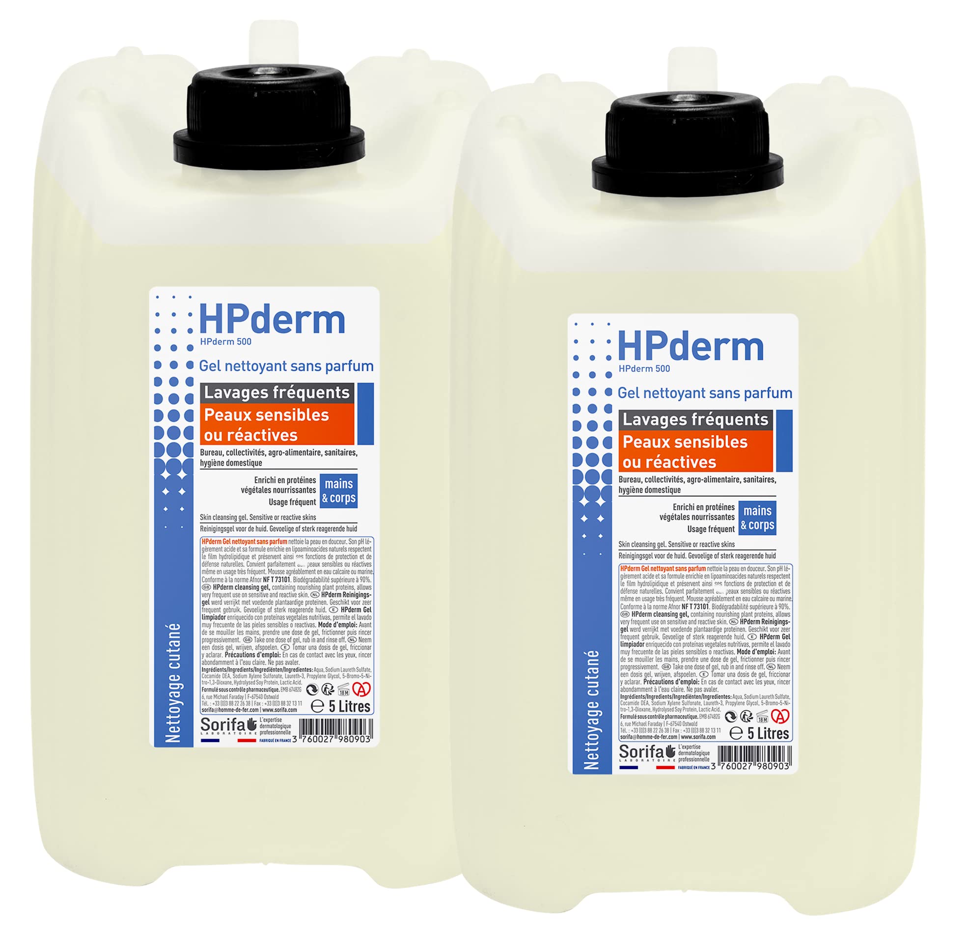 Fragrance-free cleansing gel for hand and body wash. Without soap, gently cleanses the skin. Fragrance-free, perfect for daily hygiene of sensitive or reactive skin, even with very frequent use. HPderm perfume-free cleaning gel works through surfactant action by emulsifying dirt. The slightly acidic pH value and the soy protein-enriched formula with nourishing, revitalizing and protective properties prevent drying out and protect the hydrolipidic film. This is how the skin gets its natural protective and defense functions. HPderm cleaning gel without foam odor pleasant even in lime water produced in France in the pharmaceutical laboratory Distribution solutions: metal wall holder with pump, available in the Dermacare--PRO shop under B00UIHTXZI INGREDIENTS Aqua, Cocamide DEA, sodium laureth sulfate, sodium xylene sulfonate, laureth-3, hydrolyzed soy protein, phenethyl alcohol, caprylyl glycol, lactic acid, dehydroacide, disodium EDTA. INSTRUCTIONS FOR USE Without wetting your hands, take a dose of gel and rub until the dirt is emulsified. Add a little water, rub and rinse. Dry well. SAFETY WARNING For external use only. See morepH neutral. Enriched with soy protein with nourishing and revitalizing properties. Daily hygiene, water-soluble or greasy dirt. Specially for sensitive or reactive skin. Made in France in the pharmaceutical laboratory. Cleansing gel for frequent use.HPderm reinigingsgel zonder parfum - veelvuldig wassen - gevoelige of reactieve huid - handen en lichaam - met beschermende soja-eiwitten - pH-neutraal, zonder zeep - jerrycan 5 l Parfumvrije reinigingsgel voor hand- en lichaamswas. Zonder zeep, reinigt de huid zacht. Zonder parfum, perfect voor de dagelijkse hygiëne van gevoelige of reactieve huid, ook bij zeer veelvuldig gebruik. HPderm parfumvrije reinigingsgel werkt door oppervlakteactieve werking door emulgeren van vuil. De licht zure pH-waarde en de met soja-eiwit verrijkte formule met verzorgende, revitaliserende en beschermende eigenschappen voorkomen uitdrogen en beschermen de hydrolipidenfilm. Zo krijgt de huid zijn natuurlijke beschermende en afweerfuncties. HPderm reinigingsgel zonder schuimgeur aangenaam ook in kalkwater geproduceerd in Frankrijk in het farmalaboratorium Distributie-oplossingen: metalen wandhouder met pomp, verkrijgbaar in de Dermacare--PRO shop onder B00UIHTXZI INGREDIËNTEN Aqua, Cocamide DEA, natriumlaurethsulfaat, natriumxyleensulfonaat, laureth-3, gehydrolyseerde soy-eiwit, fenethyl alcohol, caprylylglycol, lactisch zuur, dehydroacide, disodium EDTA. GEBRUIKSAANWIJZING Zonder je handen nat te maken, neem je een dosis gel en wrijf je tot het vuil is geëmulgeerd. Een beetje water toevoegen, wrijven en afspoelen. Goed drogen. VEILIGHEIDSWAARSCHUWING Alleen voor uitwendig gebruik. Meer bekijkenpH-neutraal. Verrijkt met soja-eiwit met voedende en revitaliserende eigenschappen. Dagelijkse hygiëne, in water oplosbaar of vettig vuil. Speciaal voor de gevoelige of reactieve huid. Gemaakt in Frankrijk in het farmaceutische laboratorium. Reinigingsgel voor veelvuldig gebruik.