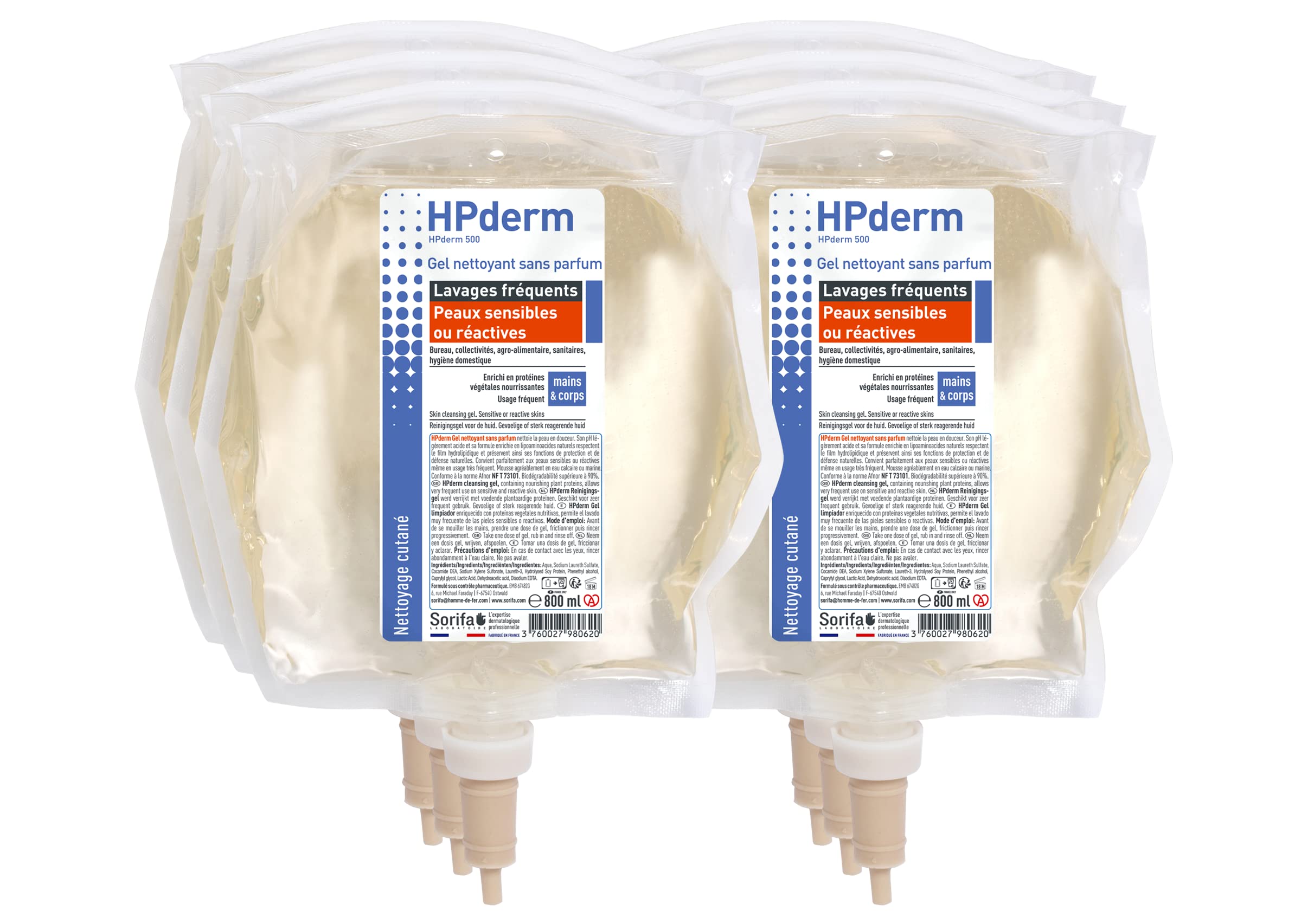 Fragrance-free cleansing gel for hand and body wash. Without soap, gently cleanses the skin. Fragrance-free, perfect for daily hygiene of sensitive or reactive skin, even with very frequent use. HPderm perfume-free cleaning gel works through surfactant action by emulsifying dirt. The slightly acidic pH value and the soy protein-enriched formula with nourishing, revitalizing and protective properties prevent drying out and protect the hydrolipidic film. This is how the skin gets its natural protective and defense functions. HPderm cleaning gel without foam odor, pleasant, even in lime water, produced in France in the pharmaceutical laboratory, distributor solutions: plastic wall dispenser, lockable, Soribag, available in the Dermacare-PRO INGREDIENTS Aqua, Cocamide DEA, sodium laureth sulfate, sodium xylene sulfonate, laureth-3, hydrolyzed soy protein, phenethyl alcohol, caprylyl glycol, lactic acid, dehydroacide, disodium EDTA. INSTRUCTIONS FOR USE Without wetting your hands, take a dose of gel and rub until the dirt is emulsified. Add a little water, rub and rinse. Dry well. SAFETY WARNING For external use only. See morepH neutral. Enriched with soy protein with nourishing and revitalizing properties. Daily hygiene, water-soluble or greasy dirt. Specially for sensitive or reactive skin. Made in France in the pharmaceutical laboratory. Cleansing gel for frequent use.HPderm reinigingsgel zonder parfum - veelvuldig wassen - gevoelige of reactieve huid - handen en lichaam - met beschermende soja-eiwitten - pH-neutraal, zonder zeep - zak 800 ml Parfumvrije reinigingsgel voor hand- en lichaamswas. Zonder zeep, reinigt de huid zacht. Zonder parfum, perfect voor de dagelijkse hygiëne van gevoelige of reactieve huid, ook bij zeer veelvuldig gebruik. HPderm parfumvrije reinigingsgel werkt door oppervlakteactieve werking door emulgeren van vuil. De licht zure pH-waarde en de met soja-eiwit verrijkte formule met verzorgende, revitaliserende en beschermende eigenschappen voorkomen uitdrogen en beschermen de hydrolipidenfilm. Zo krijgt de huid zijn natuurlijke beschermende en afweerfuncties. HPderm reinigingsgel zonder schuimgeur, aangenaam, ook in kalkwater, geproduceerd in Frankrijk in het farmalaboratorium, verdeleroplossingen: wanddispenser van kunststof, afsluitbaar, Soribag, verkrijgbaar in de Dermacare-PRO INGREDIËNTEN Aqua, Cocamide DEA, natriumlaurethsulfaat, natriumxyleensulfonaat, laureth-3, gehydrolyseerde soy-eiwit, fenethyl alcohol, caprylylglycol, lactisch zuur, dehydroacide, disodium EDTA. GEBRUIKSAANWIJZING Zonder je handen nat te maken, neem je een dosis gel en wrijf je tot het vuil is geëmulgeerd. Een beetje water toevoegen, wrijven en afspoelen. Goed drogen. VEILIGHEIDSWAARSCHUWING Alleen voor uitwendig gebruik. Meer bekijkenpH-neutraal. Verrijkt met soja-eiwit met voedende en revitaliserende eigenschappen. Dagelijkse hygiëne, in water oplosbaar of vettig vuil. Speciaal voor de gevoelige of reactieve huid. Gemaakt in Frankrijk in het farmaceutische laboratorium. Reinigingsgel voor veelvuldig gebruik.