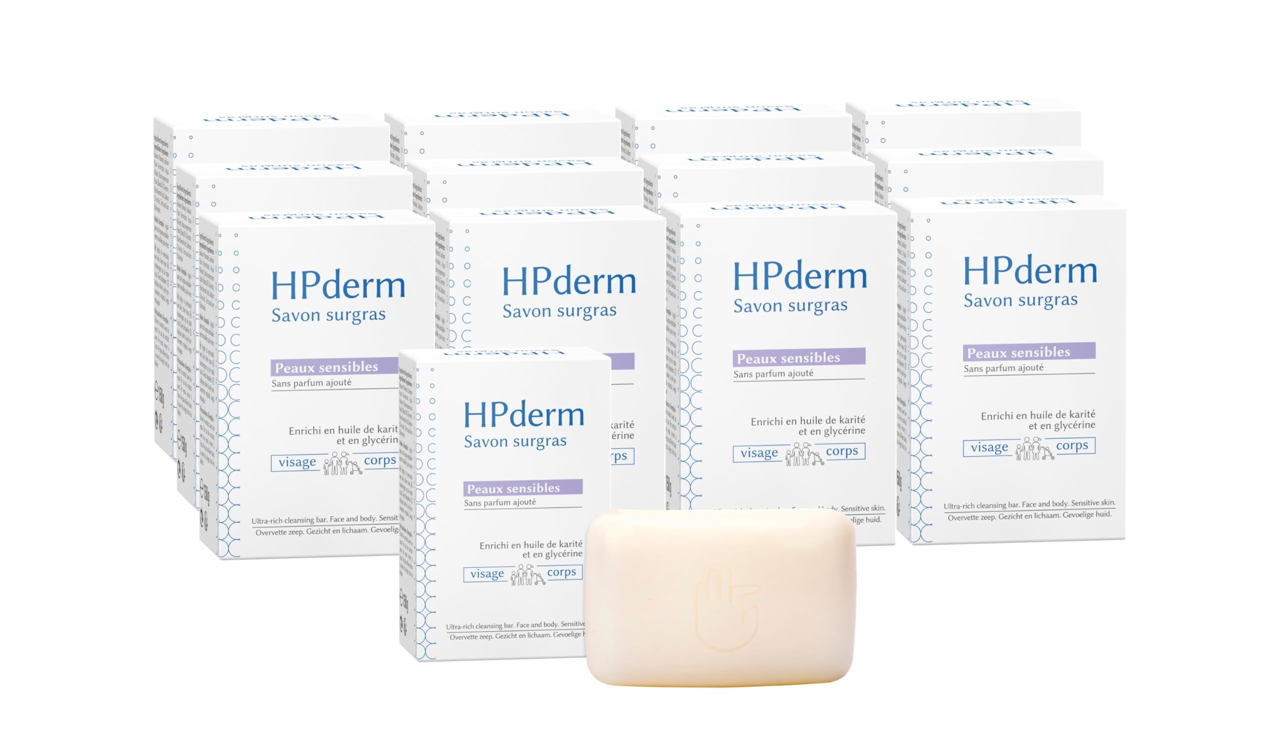 HPderm Superfat Soap for Sensitive Skin is a superfatted soap specially developed for the daily hygiene of sensitive skin. It can be used on the face and body and is suitable for the whole family, including infants. HPderm Superfat Soap for Sensitive Skin gently cleanses the skin without drying it out. Its vegetable-based soap is enriched with naturally derived moisturizing and protective active ingredients: shea butter with soothing and protective properties, and vegetable glycerin with moisturizing and softening properties. HPderm Superfat Soap for Sensitive Skin thus preserves the integrity and natural protective role of the epidermis and prevents it from drying out. Formulated to minimize the risk of allergies and sensitization, it allows for very frequent washing of even the most sensitive skin. Formulated without added fragrance and dermatologically tested. Made in France under pharmaceutical control. INDICATIONS Superfatted soap for the daily hygiene of sensitive skin. Formulated with 99.95 natural ingredients and no added fragrance, it is suitable for the whole family, including infants. INGREDIENTS Sodium Palmate, Sodium Palm Kernelate, Aqua (Water), Butyrospermum Parkii (Shea) Oil, Glycerin, Palm Kernel Acid, Sodium Chloride, Tetrasodium Etidronate. DIRECTIONS Apply to wet skin, then rinse. Dry thoroughly. SAFETY WARNING For external use only. See moreGently cleanses the skin without drying it out. Enriched with moisturizing, softening, and repairing ingredients: glycerin and shea butter. High-tolerance formula, 99.95 natural origin. For the whole family, including babies. Face and body. Daily hygiene for sensitive skin.SORIFA - Lot de 12 - HPderm Savon surgras –Peaux sensibles - 99,95 d'ingrédients naturels – Enrichi en huile de karité et glycérine – Famille dont nourrissons - pH neutre, sans parfum - Pain 150 grDESCRIPTION DU PRODUIT DESCRIPTION DU PRODUIT HPderm Savon surgras Peaux sensibles est un savon surgras spécialement développé pour l'hygiène quotidienne des peaux sensibles. Il s'utilise pour le visage et pour le corps et convient pour toute la famille, y compris les nourrissons. HPderm Savon surgras Peaux sensibles nettoie la peau en douceur sans la dessécher. Sa base savon d'origine végétale est enrichie en actifs hydratants et protecteurs d'origine naturelle : l'huile de karité aux propriétés apaisantes et protectrices et la glycérine végétale aux propriétés hydratantes et adoucissantes. HPderm Savon surgras Peaux sensibles préserve ainsi l'intégrité et le rôle protecteur naturel de l'épiderme et évite son dessèchement. Elaboré en vue de minimiser au maximum les risques d'allergie et de sensibilisation, il permet le lavage très fréquent des peaux les plus sensibles. Formule sans parfum ajouté et testée sous contrôle dermatologique. Fabriqué en France sous contrôle pharmaceutique. INDICATIONS Savon surgras pour l'hygiène quotidienne des peaux sensibles. Formule 99,95 d'origine naturelle, sans parfum ajouté, il convient pour toute la famille, y compris les nourrissons. INGRÉDIENTS Sodium Palmate, Sodium Palm Kernelate, Aqua (Water), Butyrospermum Parkii (Shea) Oil, Glycerin, Palm Kernel Acid, Sodium Chloride, Tetrasodium Etidronate. MODE D'EMPLOI Appliquer sur la peau préalablement mouillée, puis rincer. Bien sécher. AVERTISSEMENT DE SÉCURITÉ Usage externe uniquement. Voir plusNettoie la peau en douceur sans la dessécher. Enrichi en actifs hydratants, adoucissants et réparateurs : glycérine et huile de Karité. Formule haute tolérance, 99,95 d'origine naturelle. Pour toute la famille y compris les nourrissons. Visage et corps. Hygiène quotidienne des peaux sensibles.