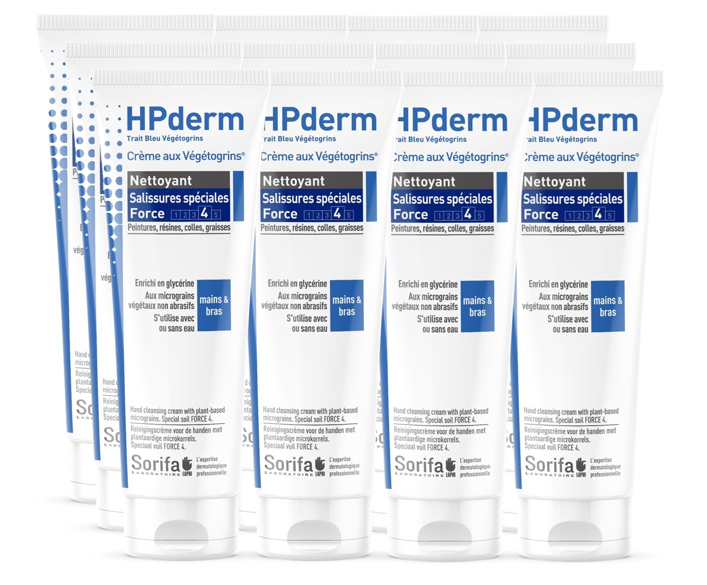 HPderm Cleansing Cream with Vegetogrins FORCE 4 is designed for cleaning hands and arms. This cleansing cream is used in the construction industry, by tradespeople, on mobile work sites, in bodywork, printing, heavy industry mechanics, and road maintenance. HPderm Cleansing Cream with Vegetogrins FORCE 4 effectively removes stubborn or special soiling, such as: grease, grime, paints, varnishes, inks, sealants, tars, glues, foams, epoxy or polyurethane resins, etc. Thanks to its exclusive composition and moisturizing agents, HPderm Cleansing Cream with Vegetogrins FORCE 4 gently cleanses the skin. Its formula, based on biodegradable solvents of renewable origin, avoids the use of solvents that can be corrosive, toxic, or dangerous. Dirt is easily emulsified and removed by rinsing. The cleaning power of this cream is enhanced by the presence of Vegetogrins. These are skin-friendly plant-based micro-grains selected for their ability to facilitate cleansing of the epidermis and preserve its integrity. Biodegradable, they do not clog drains. HPderm Cleansing Cream with Plant-Based Grains FORCE 4 contains no petroleum solvents and avoids the uncontrolled use of industrial solvents. Made in France under pharmaceutical control. INDICATIONS HPderm Cleansing Cream with Plant-Based Grains FORCE 4 is a cleansing cream with plant-based micro-grains for cleaning hands and arms. HPderm Cleansing Cream with Plant-Based Grains FORCE 4 removes stubborn or special soiling, such as grease, grime, paint, ink, sealants, tar, glues, foams, varnishes, and epoxy or polyurethane resins. INGREDIENTS Aqua, Paraffinum Liquidum, Methylether Dipropylene Glycol, PEG-40 Hydrogenated Castor Oil, Dimethyl Glutarate, Propylene Carbonate, Vegetable Grits, Citrus Aurantium Dulcis Oil, Dimethyl Succinate, Dimethyl Adipate, Carbomer, Disodium Cocoamphodipropionate, Sodium Hydroxide, Linalool. DIRECTIONS FOR USE Without wetting your hands, take a dose of cream and rub until dirt is emulsified. Add a little water, rub, then rinse. Dry thoroughly. If water is unavailable, wipe with a cloth. SAFETY WARNING For external use only. Do not swallow. Store away from frost and heat. See moreGrease, grime, sealants, tars. Can be used with or without water. Made with biodegradable solvents from renewable sources. With non-abrasive plant-based fillers. Hands and body. Cleansing cream.SORIFA - Lot de 12 – HPderm Crème nettoyante aux Végétogrins Force 4 - Mains et bras – Salissures spéciales – Graisse, peinture, encre, mastic, goudron, colle, mousse - Sans savon – Tube 125 ml.DESCRIPTION DU PRODUIT DESCRIPTION DU PRODUIT HPderm Crème nettoyante aux Végétogrins FORCE 4 est destiné au nettoyage des mains et bras. Cette crème nettoyante s'utilise dans les métiers du BTP, artisans, chantiers mobiles, carrosserie, imprimerie, mécanique dans l'industrie lourde, voirie. HPderm Crème nettoyante aux Végétogrins FORCE 4 élimine avec efficacité les salissures tenaces ou spéciales, comme : les graisses, les cambouis, les peintures, vernis, encres, les mastics, goudrons, les colles, mousses, les résines époxy ou polyuréthane…. Grâce à sa composition exclusive et à ses agents hydratants, HPderm Crème nettoyante aux Végétogrins FORCE 4 nettoie la peau en douceur. Sa formule à base de solvants biodégradables d'origine renouvelable évite l'usage de solvants pouvant être corrosifs, toxiques ou dangereux. Les salissures sont facilement émulsionnées et éliminées par rinçage. Le pouvoir nettoyant de cette crème est renforcé par la présence de Végétogrins. Ce sont des micro-grains végétaux dermocompatibles sélectionnés pour leur capacité à faciliter le nettoyage de l'épiderme et préserver son intégrité. Biodégradables, ils n'obstruent pas les canalisations. HPderm Crème nettoyante aux Végétogrins FORCE 4 ne contient pas de solvants pétroliers et évite l'utilisation non contrôlée de solvants industriels. Fabriqué en France sous contrôle pharmaceutique. INDICATIONS HPderm Crème nettoyante aux Végétogrins FORCE 4 est une crème nettoyante aux micro-grains végétaux pour le nettoyage des mains et des bras. HPderm Crème nettoyante aux Végétogrins FORCE 4 élimine les salissures tenaces ou spéciales, comme les graisses, cambouis, peintures, encres, mastics, goudrons, colles, mousses, vernis et résines époxy ou polyuréthane. INGRÉDIENTS Aqua, Paraffinum Liquidum, Methylether Dipropyleneglycol, PEG-40 Hydrogenated Castor Oil, Dimethyl Glutarate, Propylene carbonate, Vegetable Grits, Citrus Aurantium Dulcis oil, Dimethyl Succinate, Dimethyl Adipate, Carbomer, Disodium Cocoamphodipropionate, Sodium Hydroxide, Linalol. MODE D'EMPLOI Sans mouiller les mains, prendre une dose de crème et frictionner jusqu'à ce que les salissures soient émulsionnées. Ajouter un peu d'eau, frictionner puis rincer. Bien sécher. En l'absence d'un point d'eau, essuyer avec un chiffon. AVERTISSEMENT DE SÉCURITÉ Usage externe uniquement. Ne pas avaler. Conserver à l'abri du gel et de la chaleur. Voir plusGraisses, cambouis, mastics, goudrons,. S'utilise avec ou sans point d'eau. A base de solvants biodégradables d'origine renouvelable. Avec charges végétales non abrasives. Mains et corps. Crème nettoyante.
