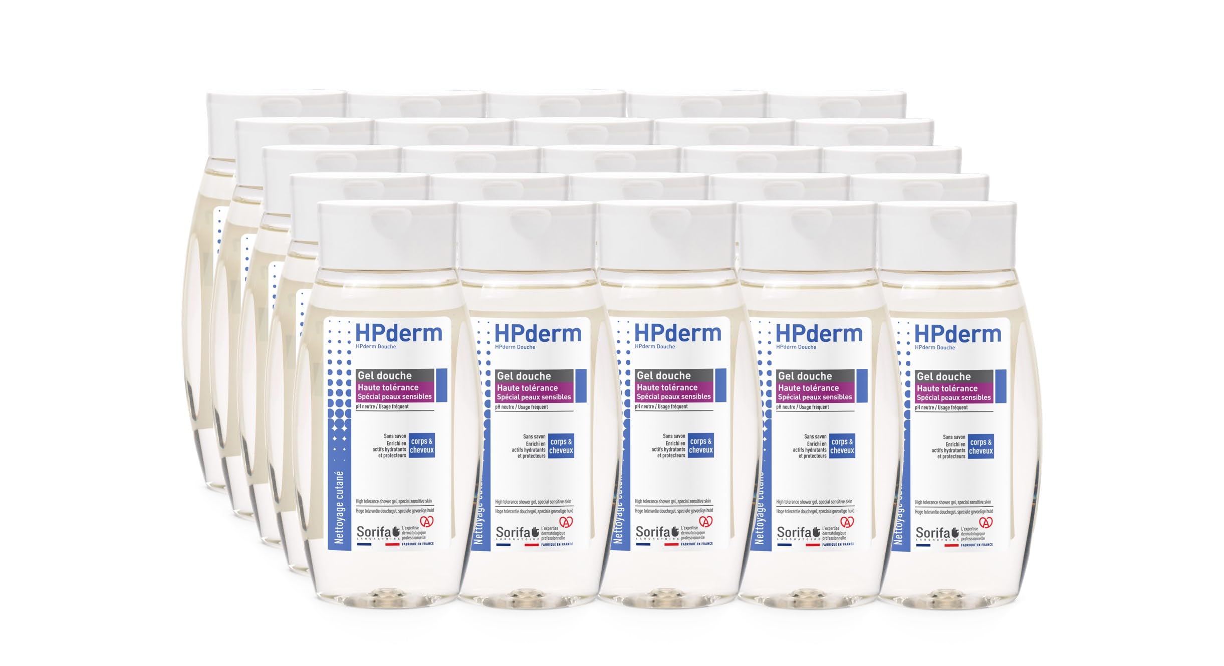 Soap-free and with excellent rinsing properties, HPderm High Tolerance Shower Gel gently cleanses skin and hair. Enriched with allantoin, known for its moisturizing properties, and with film-forming and protective agents, HPderm High Tolerance Shower Gel restores the integrity and natural protective role of the epidermis and hair. It allows for very frequent washing of sensitive skin and weakened hair. Formulated to minimize the risk of allergies and sensitization, it leaves the skin delicately scented. HPderm High Tolerance Shower Gel lathers pleasantly, even in hard water. Made in France in a pharmaceutical laboratory. INDICATIONS HPderm High Tolerance Shower Gel is a 2-in-1 shower gel specially developed for the frequent washing of sensitive skin and weakened hair. It is perfectly suited for tattooed skin. INGREDIENTS Aqua, Sodium Laureth Sulfate, Cocamide DEA, Sodium Chloride, Cocamidopropyl Betaine, Polyquaternium-7, Allantoin, Phenethyl Alcohol, Caprylyl Glycol, Sorbic Acid, Sodium Benzoate, Disodium EDTA, Parfum, Limonene, Hexyl Cinnamal, Linalool. DIRECTIONS Pour a small amount of shower gel into your hand and rub it onto wet body and hair, then rinse. If necessary, repeat and rinse thoroughly. SAFETY WARNING For external use only. See moreExcellent rinsing properties. pH neutral, soap-free, silicone-free. Enriched with protective film-forming agents. Enriched with allantoin for its moisturizing properties. Ideal for sensitive skin, tattooed skin, and damaged hair. High-tolerance 2-in-1 formula for frequent use.SORIFA - Lot de 25 - HPderm Gel douche HAUTE TOLERANCE - 2 en 1 corps et cheveux - Spécial peaux sensibles, peaux tatouées, cheveux fragilisés - Usage fréquent - pH neutre, sans savon - Flacon 250 mlDESCRIPTION DU PRODUIT DESCRIPTION DU PRODUIT Sans savon et doué d'une excellente rinçabilité, HPderm Gel Douche Haute tolérance nettoie la peau et les cheveux en douceur. Enrichi en allantoïne aux propriétés hydratantes et en agents filmogènes et protecteurs, HPderm Gel Douche Haute tolérance restitue l'intégrité et le rôle protecteur naturel de l'épiderme et des cheveux. Il permet le lavage très fréquent des peaux sensibles et des cheveux fragilisés. Formulé pour limiter au maximum les risques d'allergie et de sensibilisation, il laisse la peau délicatement parfumée. HPderm Gel Douche Haute tolérance mousse agréablement même en eau calcaire. Fabriqué en France en laboratoire pharmaceutique INDICATIONS HPderm Gel Douche Haute tolérance est un gel douche 2 en 1 spécialement développé pour le lavage fréquent des peaux sensibles et des cheveux fragilisés. Il est parfaitement adapté pour les peaux tatouées. INGRÉDIENTS Aqua, Sodium Laureth Sulfate, Cocamide DEA, Sodium Chloride, Cocamidopropyl Betaine, Polyquaternium-7, Allantoin, Phenethyl Alcohol, Caprylyl Glycol, Sorbic Acid, Sodium Benzoate, Disodium EDTA, Perfume, Limonene, Hexyl Cinnamal, Linalool. MODE D'EMPLOI Verser une dose de gel douche dans la main et frictionner corps et cheveux mouillés, puis rincer. Si besoin, renouveler l'opération puis rincer soigneusement. AVERTISSEMENT DE SÉCURITÉ Usage externe uniquement. Voir plusExcellente rinçabilité. pH neutre, sans savon, sans silicone. Enrichi en agents filmogènes protecteurs. Enrichi en allantoine aux propriétés hydratantes. Spécial peaux sensibles, peaux tatouées et cheveux fragilisés. Formule 2 en 1 haute tolérance usage fréquent.