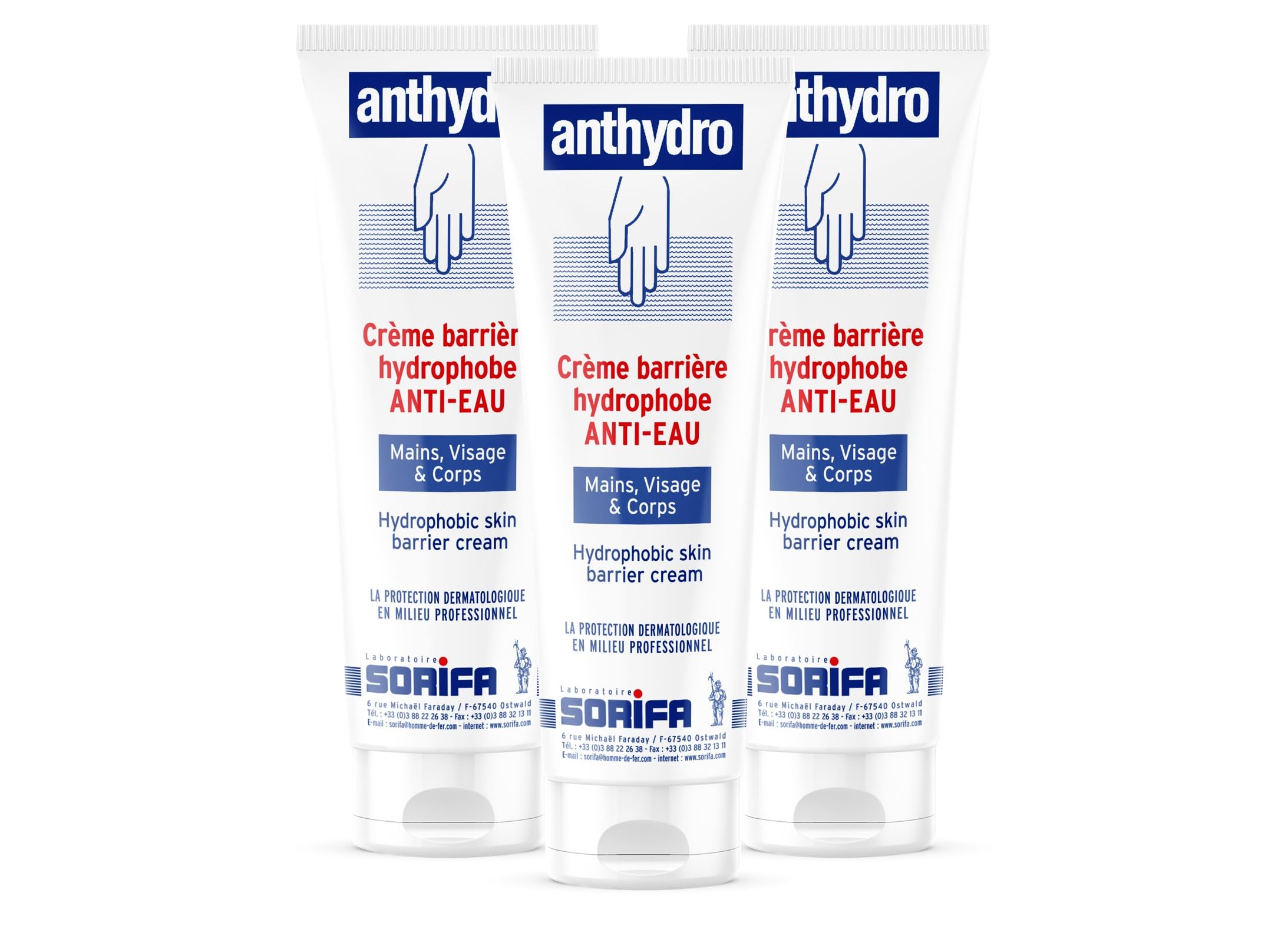 Anthydro is a hydrophobic, water-resistant barrier cream that protects reactive skin or skin in prolonged and or frequent contact with: water, aqueous solutions, detergents, brines, and waterborne irritants such as soluble oils. Anthydro contains silicones that protect the skin from repeated contact with water and solutions thanks to their hydrophobic properties. The silicones also prevent dirt from becoming embedded in skin folds and pores thanks to their non-adherent properties. Anthydro thus forms a flexible, non-occlusive protective barrier and preserves tactile sensitivity. Its slightly acidic pH helps maintain the skin's integrity and natural protective function. Its high-tolerance formula is low in oil and fragrance-free. It can be used on the hands, face, and body. Thanks to its anti-friction properties, Anthydro protects the skin against irritation caused by friction and prevents its occurrence. Made in France under pharmaceutical control. INDICATIONS Anthydro is a WATERPROOF and FRICTION-RESISTANT protective cream for hands, face, and body. Anthydro forms a flexible protective barrier and shields the skin against water, aqueous solutions, and detergents. Its high-tolerance formula is low in oil and fragrance-free. Anthydro can also be used to prevent skin irritations caused by friction. INGREDIENTS Aqua, Propylene Glycol Dicaprylate Dicaprate, Stearalkonium Hectorite, Propylene Carbonate, Isostearyl Diglyceryl Succinate, Dimethicone, Octyldodecanol, Propylene Glycol, Magnesium Sulfate, Benzyl Alcohol, Potassium Sorbate, Sodium Benzoate, Citric Acid. DIRECTIONS Before work or sun exposure, apply to clean, dry skin. Spread evenly over the desired area, paying particular attention to skin folds. Reapply at regular intervals or after washing. Wash off with soap after use. SAFETY WARNING For external use only. See moreAbsorbs quickly, low-greasy. Tested according to standard NFS 75-601. Non-stick, water-resistant. High-tolerance, fragrance-free formula. For hands, face, and body. Water and friction protection.SORIFA - Lot de 3 - ANTHYDRO - Crème Barrière - Protection ANTI-EAU – ANTI-FROTTEMENT - Mains, visage et corps – Haute tolérance - Sans parfum -Tube 125 mlDESCRIPTION DU PRODUIT DESCRIPTION DU PRODUIT Anthydro est une crème barrière Hydrophobe ANTI-EAU qui protège les peaux réactives ou les peaux en contact prolongé et ou fréquent avec : l'eau les solutions aqueuses les détergents les saumures les substances et les agents irritants véhiculés par l'eau telles que les huiles solubles. Anthydro contient des silicones qui protègent la peau des contacts répétés avec l'eau et les solutions grâce à leur pouvoir hydrophobe. Les silicones empêchent également l'incrustation des salissures dans les plis et les pores de la peau grâce à leur pouvoir anti-adhérent. Anthydro forme ainsi un écran protecteur souple non occlusif et préserve la sensibilité tactile. Son pH légèrement acide permet de préserver l'intégrité et le rôle protecteur naturel de la peau. Sa formule haute tolérance est peu grasse et sans parfum. Elle peut s'utiliser pour les mains, le visage et pour le corps. Grâce à ses propriétés ANTI-FROTTEMENT, Anthydro protège la peau contre les irritations cutanées dues aux frottements et prévient leur apparition. Fabriqué en France sous contrôle pharmaceutique. INDICATIONS Anthydro est une crème de protection ANTI-EAU et ANTI-FROTTEMENT pour mains, visage et corps. Anthydro forme un écran protecteur souple et protège la peau contre l'eau, les solutions aqueuses et les détergents. Sa formule haute tolérance est peu grasse et non parfumée. Anthydro s'utilise également dans la prévention des irritations cutanées dues aux frottements. INGRÉDIENTS Aqua, Propylene Glycol Dicaprylate Dicaprate, Stearalkonium Hectorite, Propylene Carbonate, Isostearyl Diglyceryl Succinate, Diméthicone, Octyldodecanol, Propylene Glycol, Magnesium Sulfate, Benzyl Alcohol, Potassium Sorbate, Sodium Benzoate, Citric Acid. MODE D'EMPLOI Avant le travail ou l'exposition, appliquer sur la peau propre et sèche. Bien répartir sur la zone souhaitée en insistant au niveau des plis. Renouveler l'application à intervalles réguliers ou en cas de lavage. Après le travail, se lave au savon. AVERTISSEMENT DE SÉCURITÉ Usage externe uniquement. Voir plusPénètre rapidement, peu grasse. Testée selon la norme NFS 75-601. Anti-adhérente, résiste à l'eau. Formule haute tolérance, sans parfum. Pour mains, visage et corps. Protection ANTI-EAU et ANTI-FROTTEMENTS.