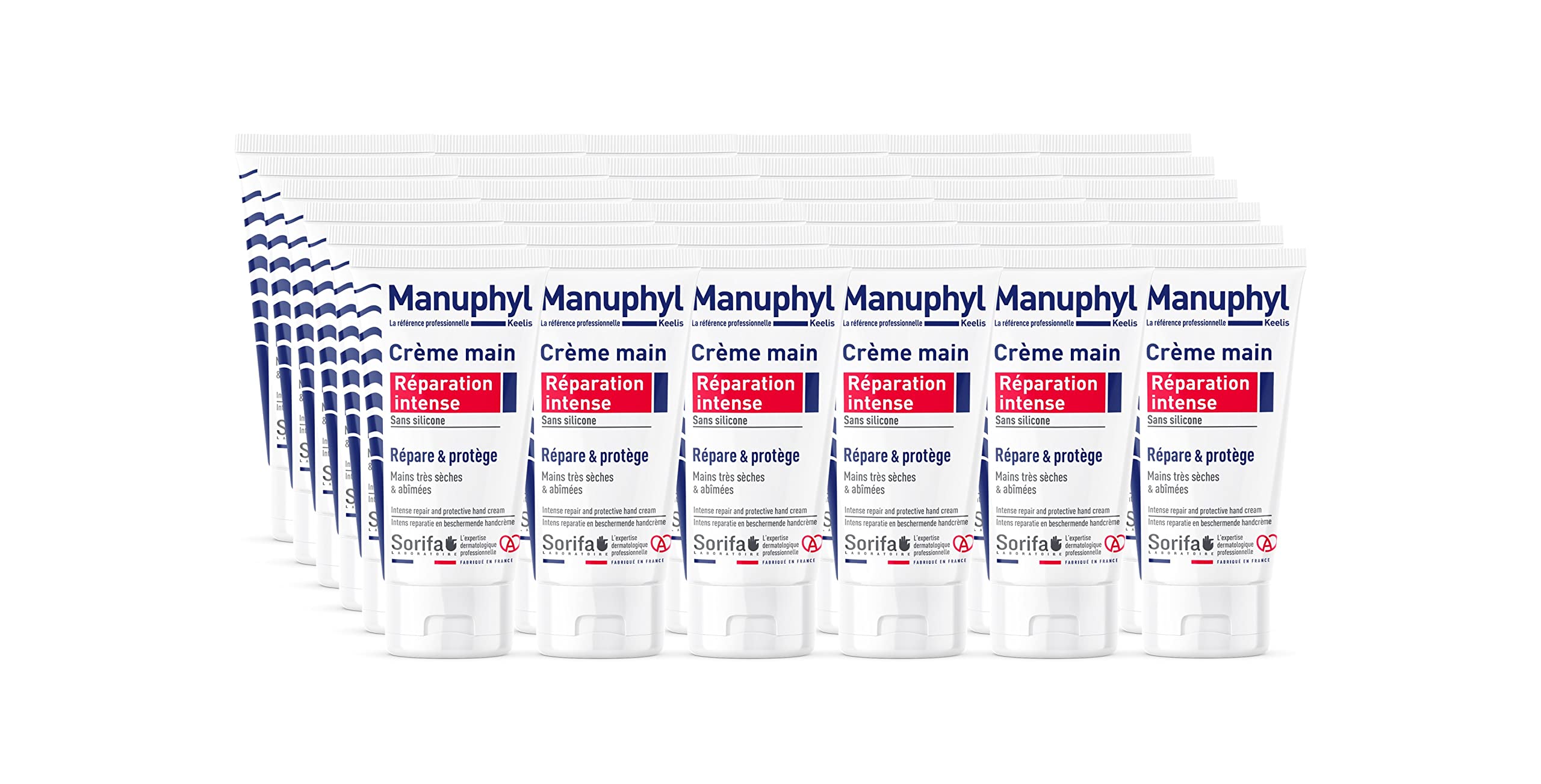 Manuphyl Intense Repair is a complete solution for the daily irritations of hands severely damaged by cold, humidity, repeated washing, work, and irritants. Enriched with wheat proteins with moisturizing and film-forming properties and vegetable glycerin with moisturizing and softening properties, Manuphyl Intense Repair nourishes and soothes irritations in damaged skin. Its specific formula leaves skin smooth and supple. The skin's natural defenses are restored, allowing it to better withstand external aggressors. Its formula is non-greasy and non-staining. Delicately scented, it is suitable for all skin types, even the most sensitive. How it works: Skin is subjected to multiple daily aggressions. The loss of integrity and cohesion of the superficial layers of the epidermis constitutes the first stage of skin dryness. Manuphyl Intense Repair Hand Cream, thanks to its formula enriched with wheat proteins, compensates for the acid deficiency of damaged skin, restores the skin's pH to its normal value, and helps maintain normal hydration levels. The glycerin in Manuphyl Intense Repair Hand Cream helps the skin regain its suppleness and regulates its natural desquamation thanks to its moisturizing properties. The skin can thus fulfill its role as a protector of the deep dermis against external aggressors. Also available: Manuphyl Intense Hydration. Made in France under pharmaceutical control. INDICATIONS Manuphyl Intense Repair Hand Cream repairs, nourishes, soothes, and protects dry to very dry hands, severely damaged by cold, humidity, washing, work, irritants, etc. INGREDIENTS Aqua, Glycerin, Isopropyl Palmitate, Cetearyl Alcohol, Ceteareth-33, Hydrolyzed Wheat Protein, Cetyl Alcohol, Phenethyl Alcohol, Caprylyl Glycol, Sodium Hydroxide, Perfume, Limonene, Citral, Linalool. DIRECTIONS Apply a small amount of cream to clean, dry hands 1 to 3 times a day. Massage gently, paying particular attention to fragile areas (nails, between fingers, etc.). SAFETY WARNING For external use only. See moreLight and oily. Absorbs quickly. Enriched with wheat proteins for their moisturizing and film-forming properties. Enriched with vegetable glycerin for its moisturizing and softening properties. Nourishes and soothes. Repairs and protects severely damaged hands.SORIFA - Lot de 36 Manuphyl Crème mains Réparation Intense – Répare et protège – Mains très sèches et abîmées - Peu grasse, légèrement parfumée, enrichie en glycérine et protéines de blé - Tube 50 mlDESCRIPTION DU PRODUIT DESCRIPTION DU PRODUIT Manuphyl Réparation intense est une réponse complète aux irritations quotidiennes des mains fortement abîmées par le froid, l'humidité, les lavages répétés, les travaux et les substances irritantes. Enrichie en protéines de blé aux propriétés hydratantes et filmogènes et en glycérine végétale aux propriétés hydratantes et adoucissantes, Manuphyl Réparation intense nourrit et apaise les irritations des peaux agressées. Sa formule spécifique rend la peau lisse et souple. Les défenses naturelles de la peau sont restaurées et permettent de mieux affronter les agressions extérieures. Sa formule est non grasse et ne tache pas. Délicatement parfumée, elle convient à tous les types de peau même les plus sensibles. Mode d'action : La peau subit de multiples agressions quotidiennes. La perte de l'intégrité et de la cohésion des couches superficielles de l'épiderme constitue le premier stade du dessèchement cutané. Manuphyl Crème main Réparation intense, grâce à sa formule enrichie en protéines de blé compense le déficit acide de la peau agressée, ramène le pH cutané à sa valeur normale et aide au maintien d'un taux d'hydratation normal. La glycérine contenue dans Manuphyl Crème main Réparation intense aide la peau à retrouver sa souplesse et régule sa desquamation naturelle grâce à son pouvoir humectant. La peau peut ainsi assurer son rôle de protecteur du derme profond vis à vis des agressions extérieures. Existe aussi : Manuphyl Hydratation intense. Fabriquée en France sous contrôle pharmaceutique. INDICATIONS Manuphyl Crème main Réparation intense répare, nourrit, apaise et protège les mains sèches à très sèches, fortement abîmées par le froid, l'humidité, les lavages, les travaux, les substances irritantes. INGRÉDIENTS Aqua, Glycerin, Isopropyl Palmitate, Cetearyl Alcohol, Ceteareth-33, Hydrolyzed Wheat Protein, Cetyl Alcohol, Phenethyl Alcohol, Caprylyl glycol, Sodium Hydroxyde, Perfume, Limonene, Citral, Linalool. MODE D'EMPLOI Appliquer une noisette de crème sur les mains propres et sèches 1 à 3 fois par jour. Masser légèrement en insistant sur les zones fragiles (ongles, entre les doigts.). AVERTISSEMENT DE SÉCURITÉ Usage externe uniquement. Voir plusPeu grasse. Pénétration rapide. Enrichie en protéines de blé aux propriétés hydratantes et filmogènes. Enrichie en glycérine végétale aux propriétés hydratantes et adoucissantes. Nourrit et apaise. Répare protège les mains fortement abîmées.