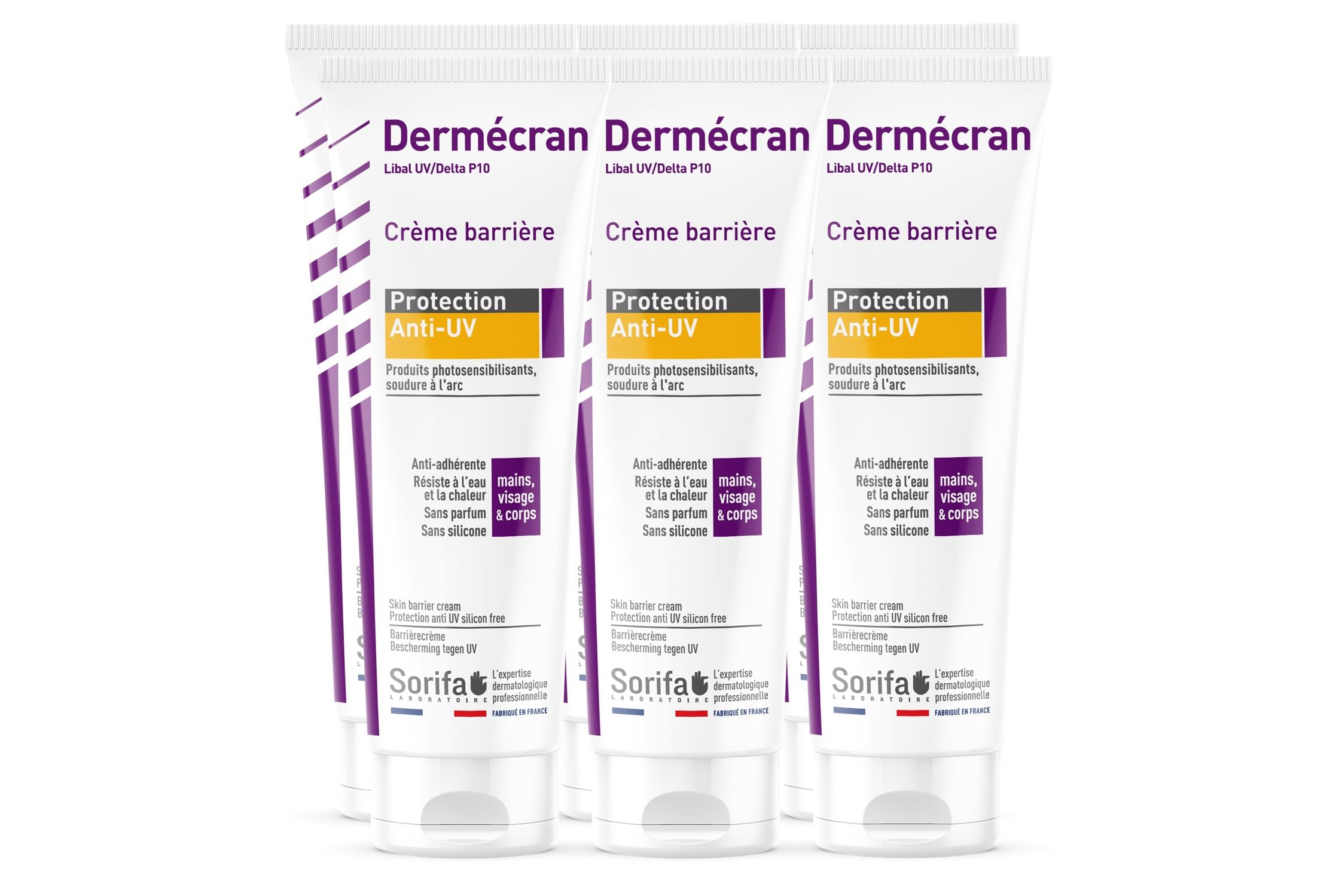 Dermécran UV Protection is a protective cream that shields skin exposed to UV radiation during certain activities such as arc welding or some varnish drying techniques, and to photosensitizing products such as coal tar, tar, and creosote. In addition, Dermécran UV Protection, thanks to its specific formulation, prevents the adhesion of photosensitizing soils, thus avoiding the development of serious dermatological lesions. Dermécran UV Protection forms a flexible, non-occlusive protective barrier and preserves tactile sensitivity. Its slightly acidic pH helps maintain the integrity and natural protective function of the skin. Its high-tolerance, fragrance-free formula is non-greasy and silicone-free. The absence of silicones in the Dermécran UV Protection formulation allows its use in workplaces where these components are prohibited due to their non-adherent properties. Made in France under pharmaceutical control. INDICATIONS Dermécran UV Protection is a protective cream for hands, face, and body. Dermécran UV Protection protects the skin against UV rays, arc welding, and photosensitizing products. INGREDIENTS Aqua, Propylene Glycol, Palmitic Acid, Stearic Acid, Paraffinum Liquidum, Cera Microcristallina, Paraffin, Ethylhexyl Methoxycinnamate, Glyceryl Stearate, PEG-6 Stearate, PEG-32 Stearate, Butyl Methoxydibenzolymethane, Cetyl Alcohol, Phenoxyethanol, Methylparaben, Ethylparaben. DIRECTIONS FOR USE Before work or sun exposure, apply to clean, dry skin. For application to the hands, spread evenly, paying particular attention to the creases and around the nails. It is recommended to reapply at regular intervals and after each washing to ensure maximum skin protection. After use, remove by washing with soap. SAFETY WARNING For external use only. See morePreserves tactile sensitivity. Forms a flexible, non-occlusive barrier. Water and heat resistant. Non-stick. For hands, face, and body. UV protection.SORIFA - Lot de 6 – Dermécran – Crème barrière - Protection ANTI-UV – Soudure – Produits photo-sensibilisants – Mains, visage et corps – Haute tolérance – Tube 125 ml.DESCRIPTION DU PRODUIT DESCRIPTION DU PRODUIT Dermécran Protection ANTI-UV est une crème de protection qui protège la peau exposée : aux rayonnements UV lors certaines activités comme la soudure à l'arc ou certaines techniques de séchage des vernis aux produits photo-sensibilisants tels que le brai de houille, le goudron, la créosote… En complément Dermécran Protection ANTI-UV, par sa formulation spécifique, empêche l'adhérence des salissures photo-sensibilisantes et évite ainsi l'apparition des lésions dermatologiques graves. Dermécran Protection ANTI-UV forme un écran protecteur souple non occlusif et préserve la sensibilité tactile. Son pH légèrement acide permet de préserver l'intégrité et le rôle protecteur naturel de la peau. Sa formule haute tolérance sans parfum est non grasse et ne contient pas de silicone. L'absence de silicones dans la formulation de Dermécran Protection ANTI-UV permet son utilisation aux postes de travail où ces composants sont proscrits de par leurs propriétés anti-adhérentes. Fabriqué en France sous contrôle pharmaceutique. INDICATIONS Dermécran Protection ANTI-UV est une crème de protection pour les mains, le visage et le corps. Dermécran Protection ANTI-UV protège la peau contre les UV, la soudure à l'arc, les produits photo-sensibilisants. INGRÉDIENTS Aqua, Propylene Glycol, Palmitic Acid, Stearic Acid, Paraffinum Liquidum, Cera Microcristallina, Paraffin, Ethylhexyl Methoxycinnamate, Glyceryl Stearate, PEG-6 Stearate, PEG-32 Stearate, Butyl Methoxydibenzolymethane, Cetyl Alcohol, Phenoxyethanol, Methylparaben, Ethylparaben. MODE D'EMPLOI Avant le travail ou l'exposition, appliquer sur la peau propre et sèche. Pour une application sur les mains, bien répartir et insister au niveau des plis et autour des ongles. Il est recommandé de renouveler l'application à intervalles réguliers et après chaque lavage pour assurer une protection cutanée maximale. Après le travail, s'enlève par lavage au savon. AVERTISSEMENT DE SÉCURITÉ Usage externe uniquement. Voir plusPréserve la sensibilité tactile. Forme un écran souple non occlusif. Résiste à l'eau et à la chaleur. Anti-adhérente. Mains, visage et corps. Protection anti-UV.