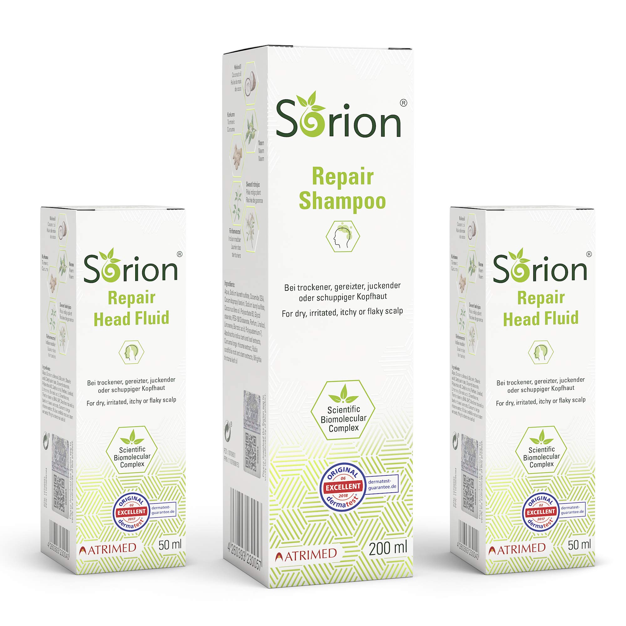 Practical care set for the intensive treatment of dry, irritated, red, itchy or flaky scalp, including 1 x Sorion Repair Shampoo (200 ml) and 2 x Sorion Head Fluid (50 ml each). The unique Ayurvedic formula with natural plant extracts of neem, turmeric, madder root, sweet indrajao and coconut oil has been specially developed for acute or chronic skin irritations. Sorion Shampoo and Sorion Head Fluid are suitable for daily use and for children (from 3 years) and pregnant women and are complementary for the effectiveness of the treatment. Head Fluid can also be used for the face and body or for rough, chapped lips and hands. Directions for use: Shake both products well before each use. Gently massage Sorion restorative shampoo into the scalp and leave to act for as long as possible. Then rinse thoroughly with lukewarm water and dry gently, avoiding heavy friction or hot air flow. Ideally, apply a layer of Sorion Head Fluid product to the affected areas for 30 to 40 minutes before going to sleep, massage briefly and leave to act overnight. Repeated application throughout the day can increase the effectiveness of the treatment. INGREDIENTS Sorion Head Fluid Ingredients: Aqua, Cocos nucifera, Glycerin, Stearic Acid, Cetyl Palmitate, Glyceryl Stearate, Polysorbate 80, Cetyl Alcohol, Perfume, Benzoic acid, Dimethicone, Trietanolamine, BHA, BHT, Azadrachta indica bark Seed Extract, Rubia Cordifolia. ot and stem extracts, Sorion Whrightia Tinctoria Leaf Oil Shampoo ingredients: water, sodium laureth sulfate, polyquaternium-7, sodium sulfate, cocamidopropyl betaine, azadirachta indica bark and leave extracts, curcuma longa rhizomes, rubia cordifolia root and stem extracts, Wrightia. tinctoria lea. af oil, Cocos nucifera oil, Cocamide DEA, Polysorbate 60, Glycol Stearate, PEG-150 Distearate, Parfum, Benzoic Acid DIRECTIONS FOR USE Apply the shampoo to damp hair, massage to lather, rinse completely, then apply the "Head Fluid" to regenerate, protect and nourish the scalp. It is recommended to use it daily. SAFETY WARNING External use only Suitable for sensitive scalps and all hair types, as well as for children (from 3 years) and during pregnancy. Skin compatibility confirmed by the German dermatological institute Dermatest with the grade "very good". Special Ayurvedic formula with natural plant extracts of neem, turmeric, madder root, mild indrajao and cold-pressed coconut oil for intensive and long-lasting care. Practical scalp care set including a gentle repair shampoo and two bottles of intensive repair lotion for tired scalps. Ensemble de soins pratiques pour le traitement intensif du cuir chevelu sec, irrité, rouge, démangeantou squameux, comprenant 1 x Sorion Repair Shampoo (200 ml) et 2 x Sorion Head Fluid (50 ml chacun). La formule ayurvédique unique aux extraits naturels de plantes de neem, de curcuma, de racine de garance, d'indrajao douce et d'huile de coco a été spécialement développée pour les irritations cutanées aiguës ou chroniques. Sorion Shampoo et Sorion Head Fluid conviennent à une utilisation quotidienne et aux enfants (à partir de 3 ans) et aux femmes enceintes et sont complémentaires pour l'efficacité du soin. Le Head Fluid peut également être utilisé pour le visage et le corps ou pour les lèvres et les mains rugueuses et gercées. Conseils d'utilisation : Bien agiter les deux produits avant chaque utilisation.Masser délicatement le shampooing réparateur Sorion sur le cuir chevelu et laisser agir aussi longtemps que possible. Puis rincer abondamment à l'eau tiède et sécher délicatement, en évitant les frottements importants ou les flux d'air chaud.Idéalement, appliquez une couche minde de produit Sorion Head Fluid sur les zones concernées pendant 30 à 40 minutes avant d'aller dormir, massez brièvement et laissez agir toute la nuit. Une application répétée tout au long de la journée peut augmenter l'efficacité du soin. INGRÉDIENTS Ingrédients Sorion Head Fluid : Aqua, Cocos nucifera, Glycerin, Stearic Acid, Cetyl Palmitate, Glyceryl Stearate, Polysorbate 80, Cetyl Alcohol, Perfume, Benzoic acid, Dimethicone, Trietanolamine, BHA, BHT, Azadrachta indica bark Seed Extract, Rubia Cordifolia. ot and stem extraits, Ingrédients du shampoing Sorion Whrightia Tinctoria Leaf Oil : eau, laureth sulfate de sodium, polyquaternium-7, sulfate de sodium, bétaine de cocamidopropyle, extraits d'azadirachta indica bark and leave extraits, curcuma longa rhizomes, racine de rubia cordifolia et extraits de stème, Wrightia. tinctoria lea. af oil, Cocos nucifera oil, Cocamide DEA, Polysorbate 60, Glycol Stearate, PEG-150 Distearate, Parfum, Benzoic Acid MODE D'EMPLOI Appliquez le shampooing sur cheveux humides, massez pour mousser, rincez complètement, puis appliquez le «Head Fluid» pour régénérer, protéger et nourrir le cuir chevelu. Il est recommandé de l'utiliser quotidiennement. AVERTISSEMENT DE SÛRETÉ Usage externe uniquement Convient au cuir chevelu sensible et à tous les types de cheveux, ainsi qu'aux enfants (à partir de 3 ans) et pendant la grossesse. Tolérance cutanée confirmée par l'institut allemand de dermatologie Dermatest avec la mention « très bien ». Recette spéciale ayurvédique avec des extraits naturels de plantes de neem, curcuma, racine de garance, indrajao doux et huile de coco pressée à froid pour des soins intensifs et durables. Ensemble pratique de soins du cuir chevelu comprenant un shampooing réparateur doux et deux flacons de lotion réparatrice intensive pour le cuir chevelu fatigué.