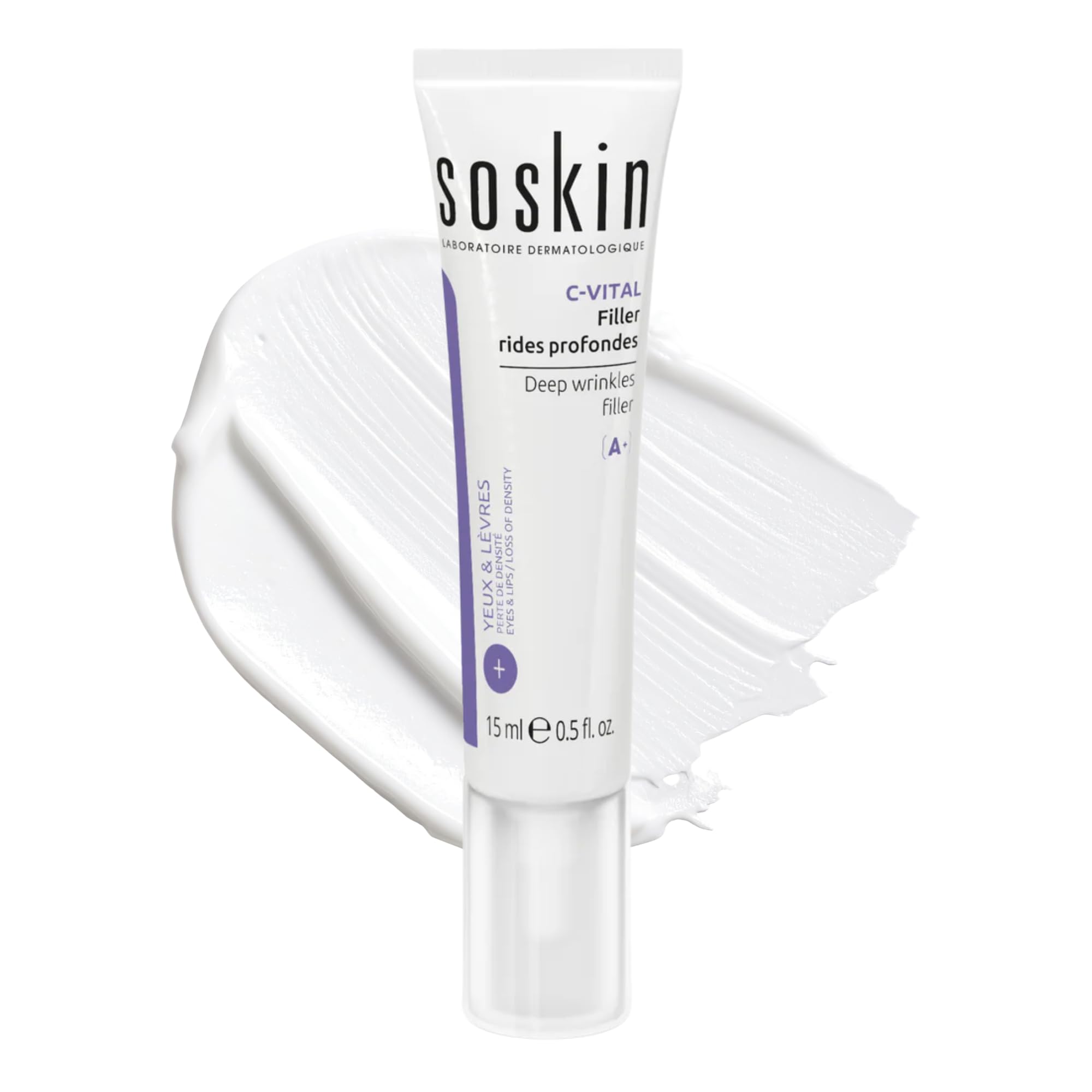SOSKIN LABORATORY: Formula tested under dermatological control. SOSKIN, a French laboratory specializing in dermatological skincare for over 30 years, develops formulas focused on tolerance and comfort. TARGETED TEXTURE RAPID ABSORPTION: Lightweight formula designed to penetrate quickly and act effectively on the eye and lip contour areas. IMPROVES FIRMNESS SUPPORT: Helps strengthen the skin's structure and restore its elasticity for a firmer, more comfortable feel. PLUMPING EFFECT IN 30 MINUTES: Helps restore volume to areas of wrinkles and improve skin density for a more supple complexion. FILLS DEEP WRINKLES: Helps reduce the appearance of established wrinkles and visibly smooth lines for a more rested face.