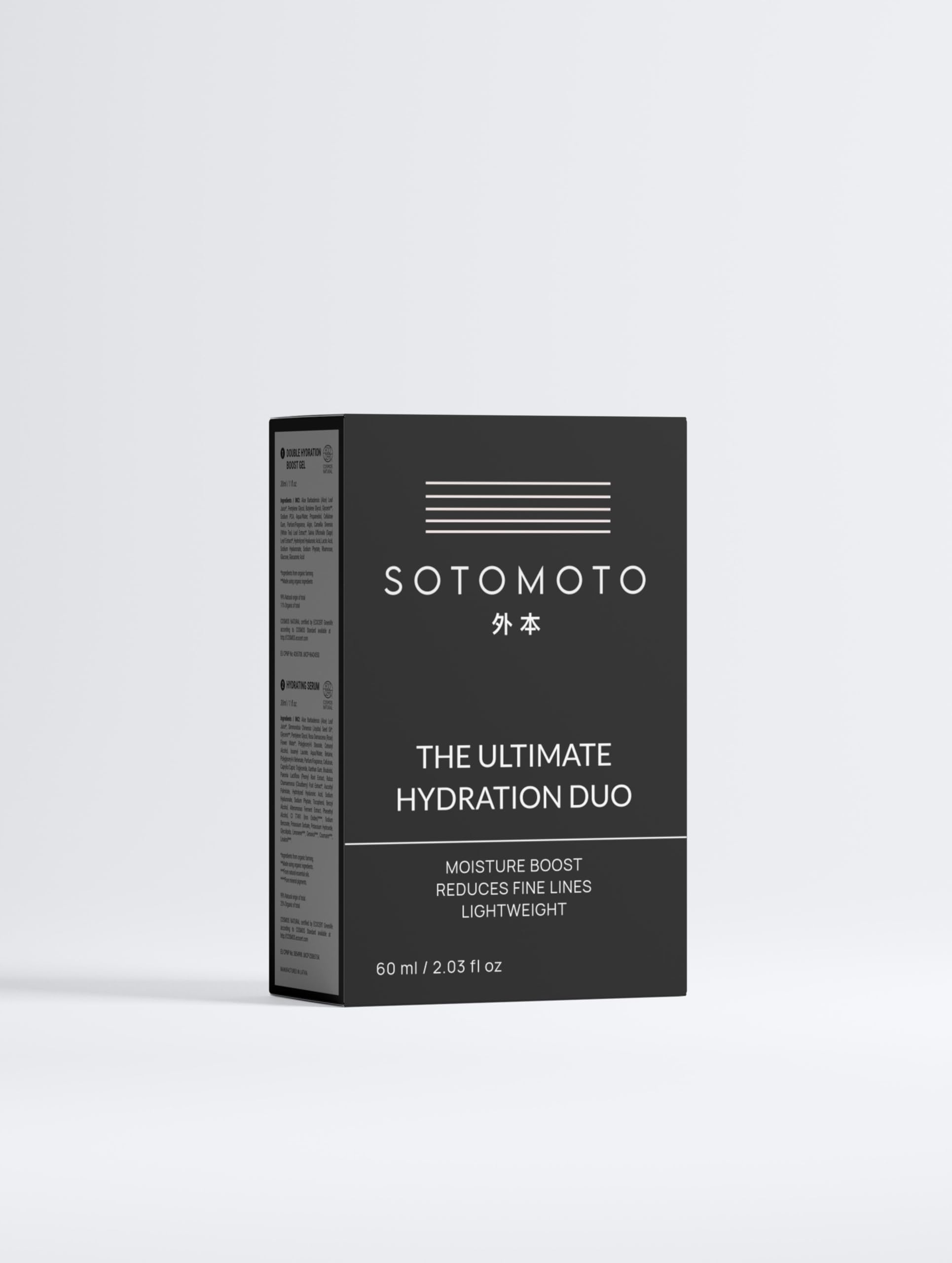 : The SOTOMOTO Hydration Duo is the perfect solution for demanding men's skin that needs intense hydration. This innovative combination consists of a lightweight hydrating serum with Cloudberry, Peony, and Bisabolol, and a powerful Double Hydration Boost Gel with hyaluronic acid and aloe vera. The serum absorbs quickly and delivers essential nutrients to the skin, while the gel noticeably plumps the skin and minimizes dehydration lines. The two-step routine is ideal for active men, whether after sports, during a stressful workday, or while traveling. The formulations are 99 naturally derived and free of synthetic fragrances and parabens. For optimal results morning and evening after cleansing, first apply the serum, then the gel, and finish with your usual moisturizer. This combination provides lasting balance to men's skin, ensuring a fresh and vibrant appearance. Safety Warning: For external use onlyCOMFORTABLE SKINCARE: Fast-absorbing textures that are easy to apply. Use morning and evening on cleansed skin. Versatile use: Perfect after sports, at work, or while traveling. Visibly balances the skin and reduces dehydration lines. Two-step application: First, the serum for vitamins and antioxidants, then the gel for deep hydration – ideal for stressed men's skin. NATURAL INGREDIENTS: 99 natural origin, vegan, and gluten-free. No synthetic fragrance or parabens. Hydration duo: Lightweight serum with Cloudberry, Peony, and Bisabolol combined with an intensely hydrating gel with hyaluronic acid for maximum moisture.Description du produit Le duo d'hydratation SOTOMOTO est la solution parfaite pour les peaux masculines exigeantes qui ont besoin d'une hydratation intense. Cette combinaison innovante se compose d'un sérum hydratant léger avec Cloudberry, Peony et Bisabolol, ainsi qu'un puissant gel double hydratation Boost à l'acide hyaluronique et à l'aloe vera. Le sérum pénètre rapidement et fournit à la peau les nutriments essentiels, tandis que le gel repulpe sensiblement la peau et minimise les rides de sécheresse. La routine en deux étapes est idéale pour les hommes actifs, que ce soit après le sport, au travail quotidien stressant ou en voyage. Les formulations sont à 99 d'origine naturelle et exemptes de parfums synthétiques et de parabens. Pour des résultats optimaux matin et soir après le nettoyage, appliquez d'abord le sérum, puis appliquez le gel et terminez avec le soin habituel. Cette combinaison équilibre durablement la peau des hommes et assure un aspect frais et vital. Avertissement De Sûreté Pour usage externe uniquementCONFORT D'ENTRETIEN : textures à absorption rapide qui sont faciles à appliquer. Utilisable matin et soir sur peau nettoyée. Utilisation polyvalente : parfait après le sport, au travail ou en voyage. Équilibre visiblement la peau et réduit les rides de sécheresse. Deux étapes d'utilisation : d'abord le sérum pour les vitamines et les antioxydants, puis le gel pour une hydratation en profondeur - Idéal pour les peaux masculines sollicitées. INGRÉDIENTS NATURELS : 99 d'origine naturelle, végétalien et sans gluten. Sans parfum synthétique ni parabène. Duo d'hydratation : sérum léger avec Cloudberry, Peony Bisabolol combiné avec un gel hydratant intense avec de l'acide hyaluronique pour une hydratation maximale.SOTOMOTO Hydration Boost Duo - Sérum hydratant et gel pour la peau des hommes - 99 d'ingrédients naturels