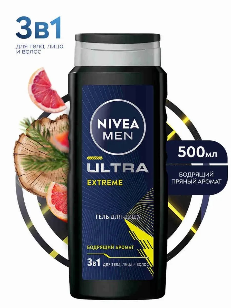 Ведете активный образ жизни? Попробуйте ароматную новинку*: Гель для душа 3в1 ULTRA EXTREME 500 мл от NIVEA MEN – коктейль мужественности, раскрывающийся во всех ее проявлениях. Взрыв аромата и бодрости, когда он необходим, сохранится даже после занятий спортом. Идеальный баланс между свежестью и силой. Новый аромат дарят мгновенное ощущение свежести и чистоты. Удивительно восточно-пряный аромат зарядит каждый миллиметр тела на новые свершения. Будьте экстремально активными вместе с NIVEA MEN. Дерматологически протестировано. pH сбалансировано** Применение: Нанесите на кожу тела, лица и волос, помассируйте и смойте.