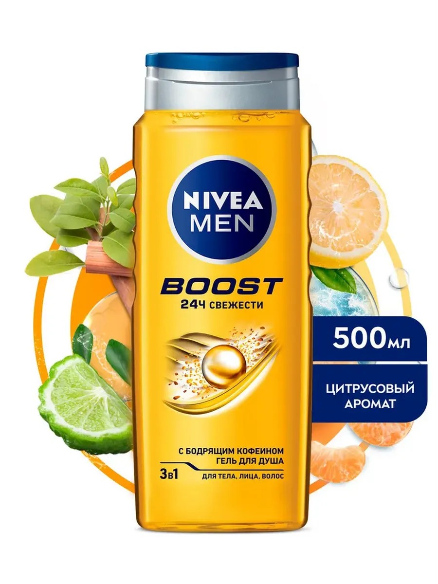 Попробуй гель для душа BOOST* 3в1 для тела, лица и волос для мужчин от NIVEA MEN для всех типов кожи. Как бодрящий глоток кофе, формула геля для душа BOOST подарит взрыв энергии. Натуральный кофеин + свежий аромат = заряд на весь день! Идеально подходит для волос, лица и тела, пробуждая каждый миллиметр вашей кожи. Проверь его в душе! Преврати ежедневное принятие душа в момент истинного наслаждения и заботы о себе. Подходит для ежедневного использования. pH-сбалансировано. Дерматологически протестировано. Мужской гель для душа можно использовать с мочалкой для скрабирования кожи. Применение: нанесите гель для душа на тело, помассируйте и смойте водой комфортной температуры. Избегайте попадания в глаза. Если кожа тела склонна к сухости, рекомендуем на чистую и сухую кожу тела после душа нанести молочко, бальзам или лосьон для тела от NIVEA.