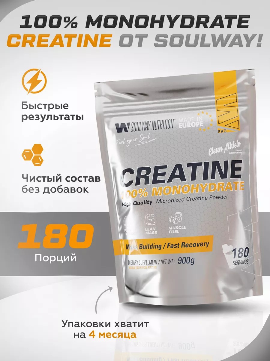 Soul Way Creatine Monohydrate 900 grams is 100% pure creatine powder designed to increase muscle energy potential and enhance strength. It is an essential amino acid produced by the body from the amino acids arginine, glycine, and methionine. Its main function is to provide the body with additional energy during intense physical activity. With regular creatine use, you will notice a decrease in muscle fatigue, improved muscle potential, and increased strength. Sports creatine also promotes muscle mass growth by activating protein synthesis in the body. Soul Way Creatine Monohydrate has the maximum concentration of the active substance and is tasteless, making it easy to take. Without additives, flavors, sugar, or sweeteners, this creatine is the benchmark for quality. For best results, dilute 3 g of powder in 200 ml of water and take up to 2 servings per day.