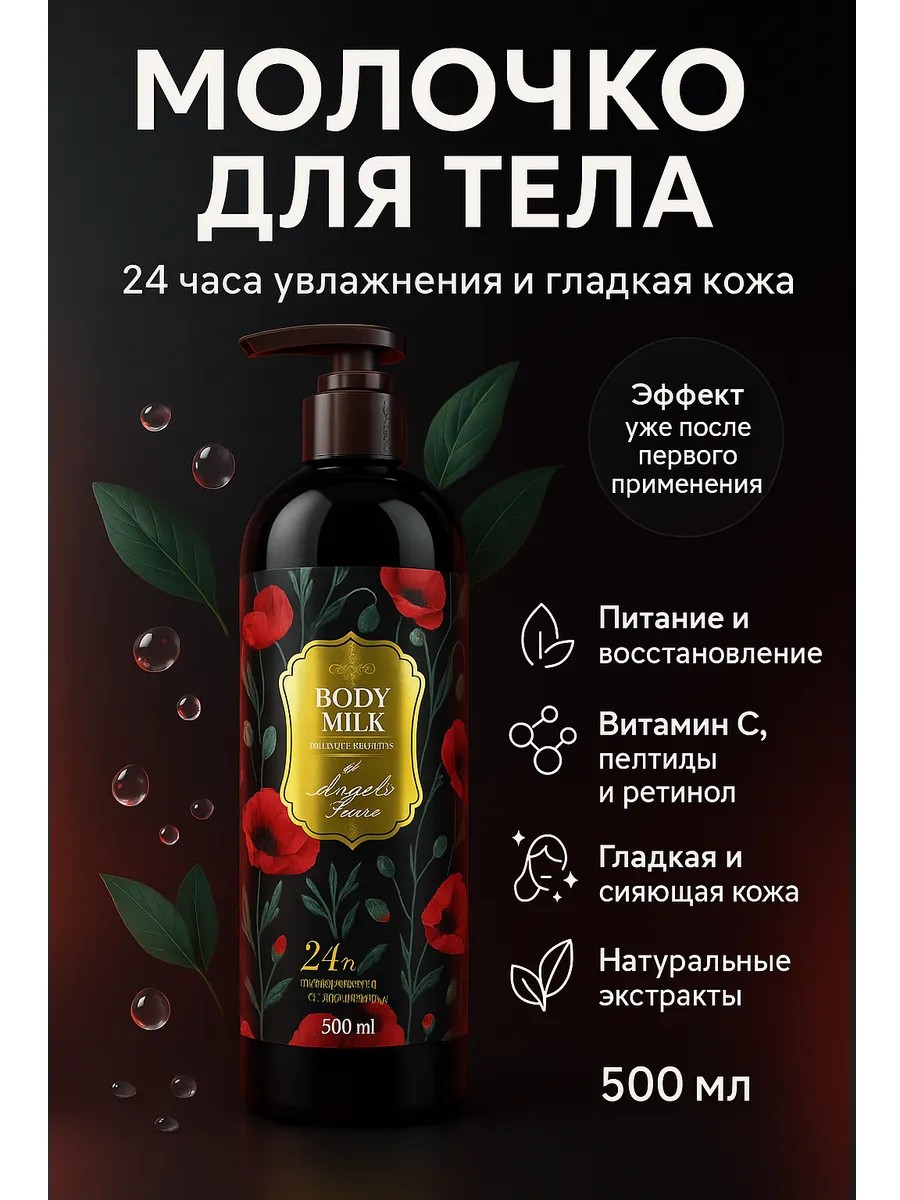 Парфюмированное молочко для тела Angel Tears 500 мл — лёгкий лосьон-крем для тела с изысканным ароматом мака и ириса. Шёлковистая текстура быстро впитывается, обеспечивая 24 ч увлажнения и питания благодаря комплексу масло ши + витамин E + экстракт мака. Формула без парабенов и минеральных масел восстанавливает защитный барьер, делает кожу гладкой, мягкой и сияющей. Подходит для сухой, нормальной и чувствительной кожи, идеально после душа, спа-процедур, для массажа, ухода за руками и телом круглый год. Большой объём 500 мл экономично расходуется, а удобный дозатор сохраняет гигиеничность.