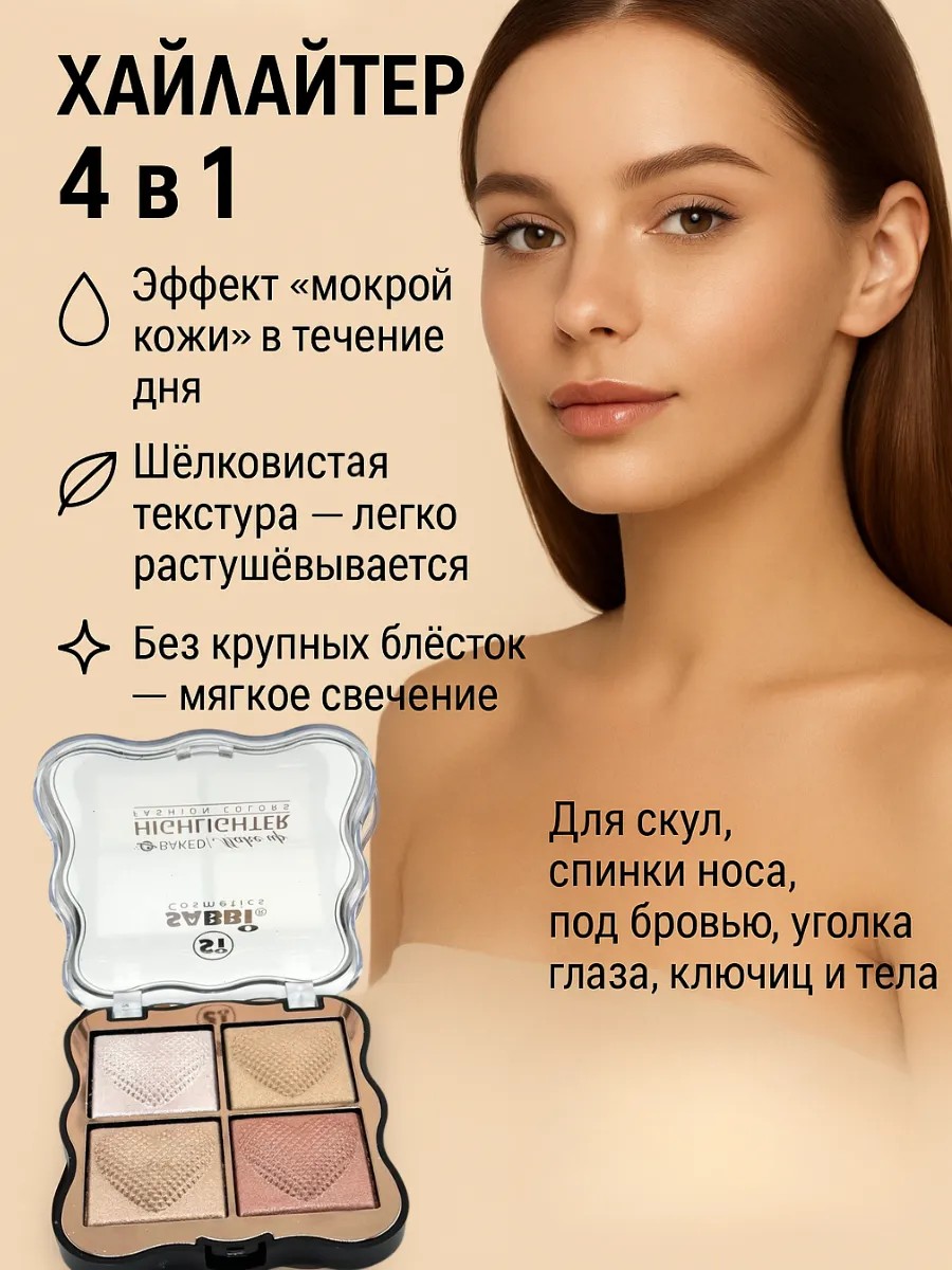 Палетка хайлайтера 4 в 1 — универсальный запечённый хайлайтер для лица и тела. В наборе 4 оттенка: жемчуг, шампань, беж, розовое золото. Шёлковистая текстура без крупных блёсток легко набирается, не пылит и равномерно растушёвывается, давая мягкое свечение и выраженный эффект «мокрой кожи» без жирного блеска. Идеальна для стробинга и контуринга: подсветка скул, спинки носа, галочки над губой, под бровью и во внутреннем уголке глаза; можно использовать как сияющие тени и топпер на румяна. Оттенки легко наслаиваются от деликатного до яркого сияния, красиво миксуются между собой, подходят и светлой, и тёплой коже. Формула помогает не подчёркивать текстуру и поры, обеспечивает стойкость в течение дня. Удобный футляр с надёжной защёлкой — компактно для косметички и путешествий.
