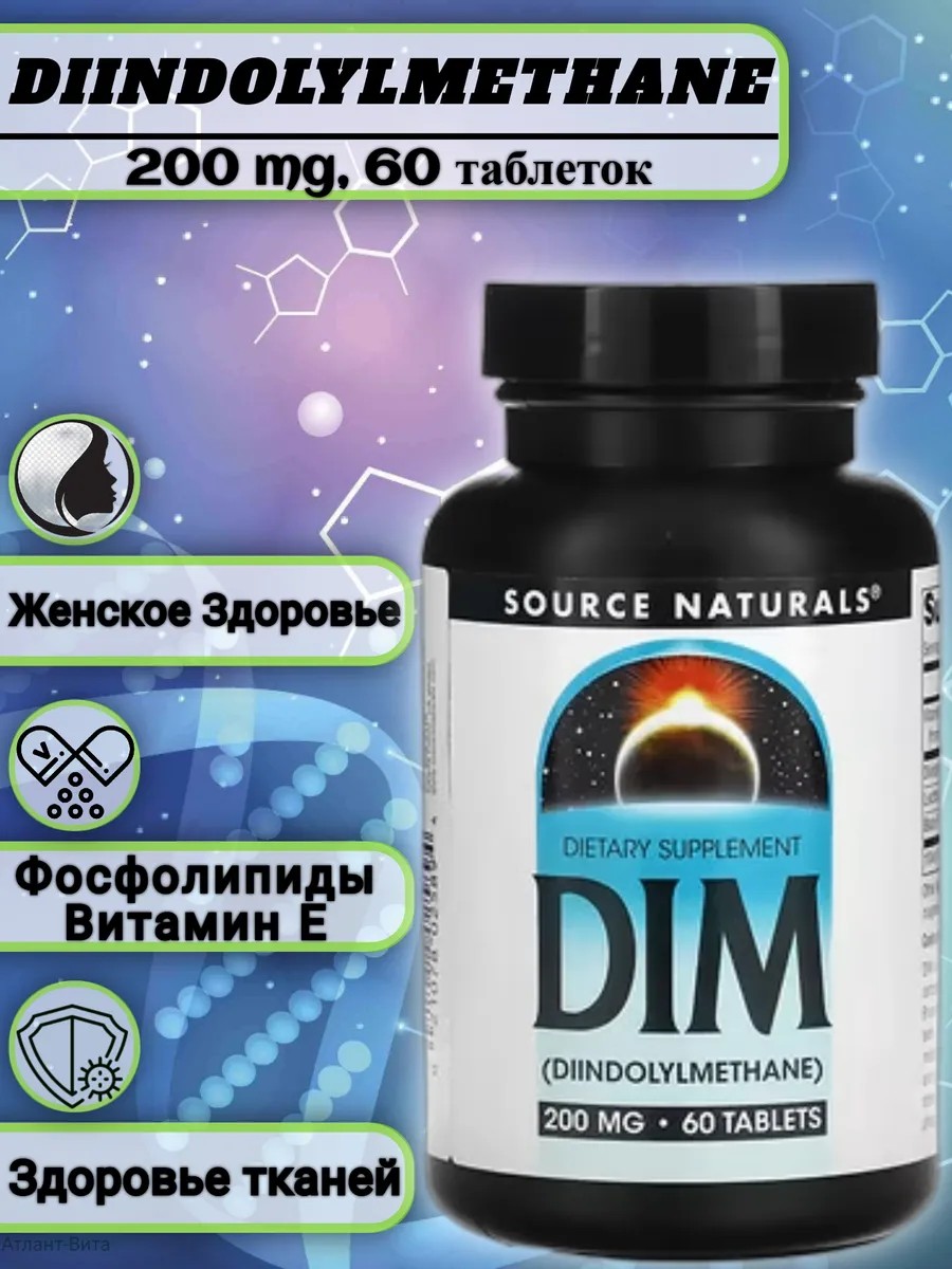 Source Naturals DIM, дииндолилметан 200 мг с биоперином, витамином Е и многим другим - 60 таблеток Source Naturals DIM,Ингредиенты Витамин Е (в виде d-альфа-токоферилсукцината), дииндолилметан (DIM), лецитин (из соевых бобов), экстракт плодов черного перца. (BioPerine), неактивные ингредиенты: микрокристаллическая целлюлоза, стеарат магния, диоксид кремния и стеариновая кислота.Дииндолилметан или DIM — фитохимическое вещество, которое является естественным метаболитом соединений, содержащихся в крестоцветных овощах, таких как брокколи, брюссельская капуста и кочанная капуста.способствует поддержанию нормального уровня эстрогенов в женском организме стимулирует расщепление жиров и способствует похудению уменьшает симптоматику предменструального синдрома и менопаузы применяется при комплексном подходе в лечении а кнеснижению риска развития новообразований и нарушений функций репродуктивной системы улучшению метаболизма эстрогенов и поддержанию в норме их баланса поддержанию здоровья предстательной железы