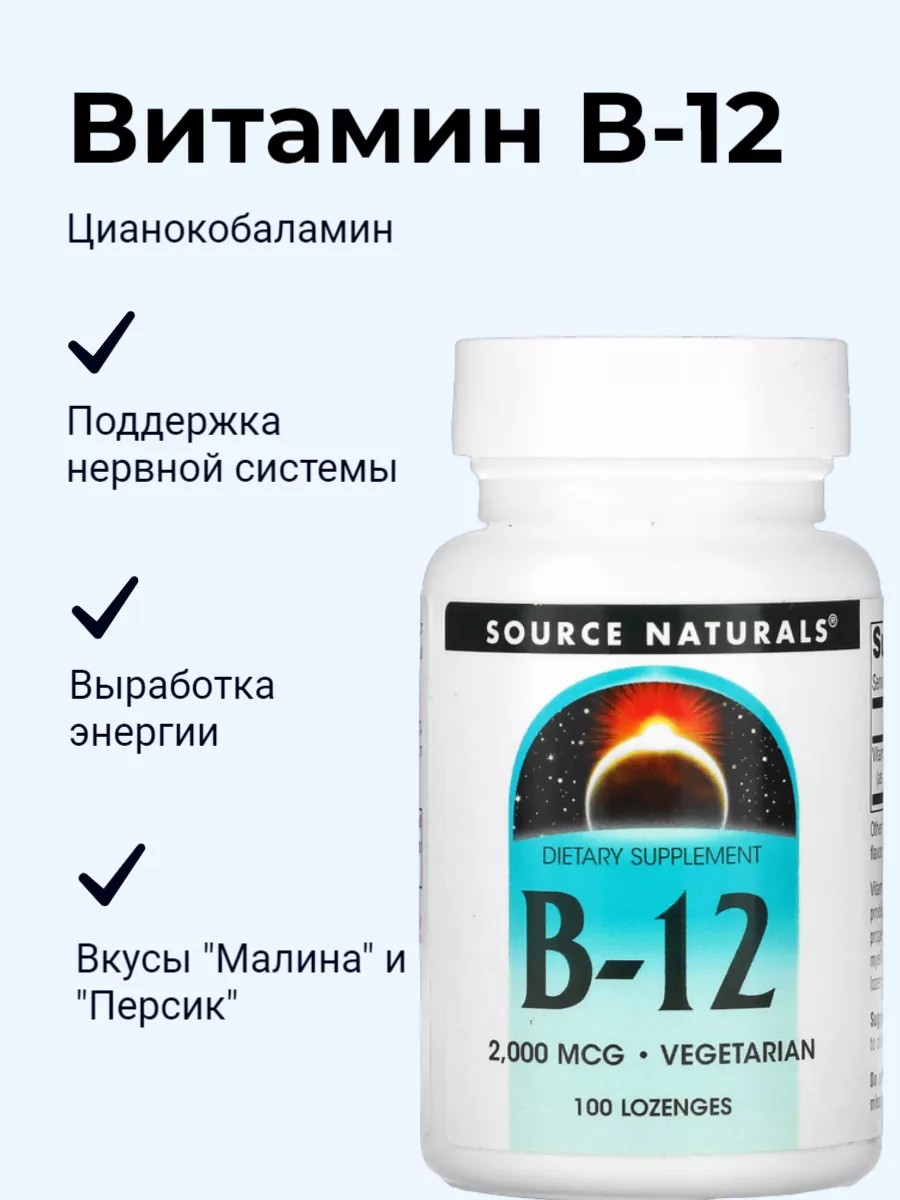 Витамин B12 является важным питательным веществом, участвующим в выработке энергии и способствующим здоровью мозга и нервной системы. Он также необходим для репликации ДНК, выработке красных кровяных клеток и образования миелиновой оболочки. Леденцы с витамином B12 от Source Naturals легко растворяются во рту.