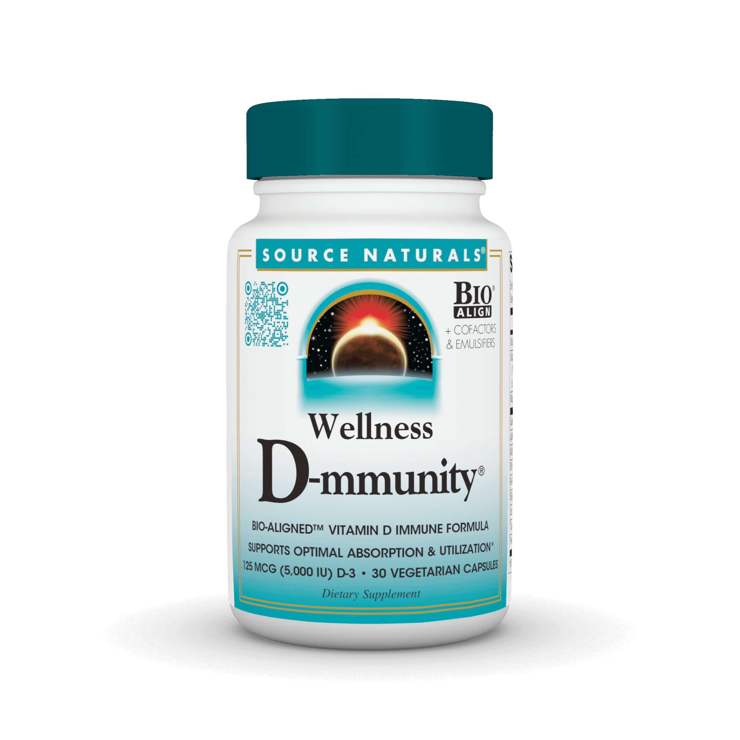 Source Naturals Wellness D-mmunity Bio-Aligned Vitamin D Immune Formula Supports Optimal Absorbtion and Utilization* 125 mcg (5 000 IU) D-3-30 Vegetarian Capsules