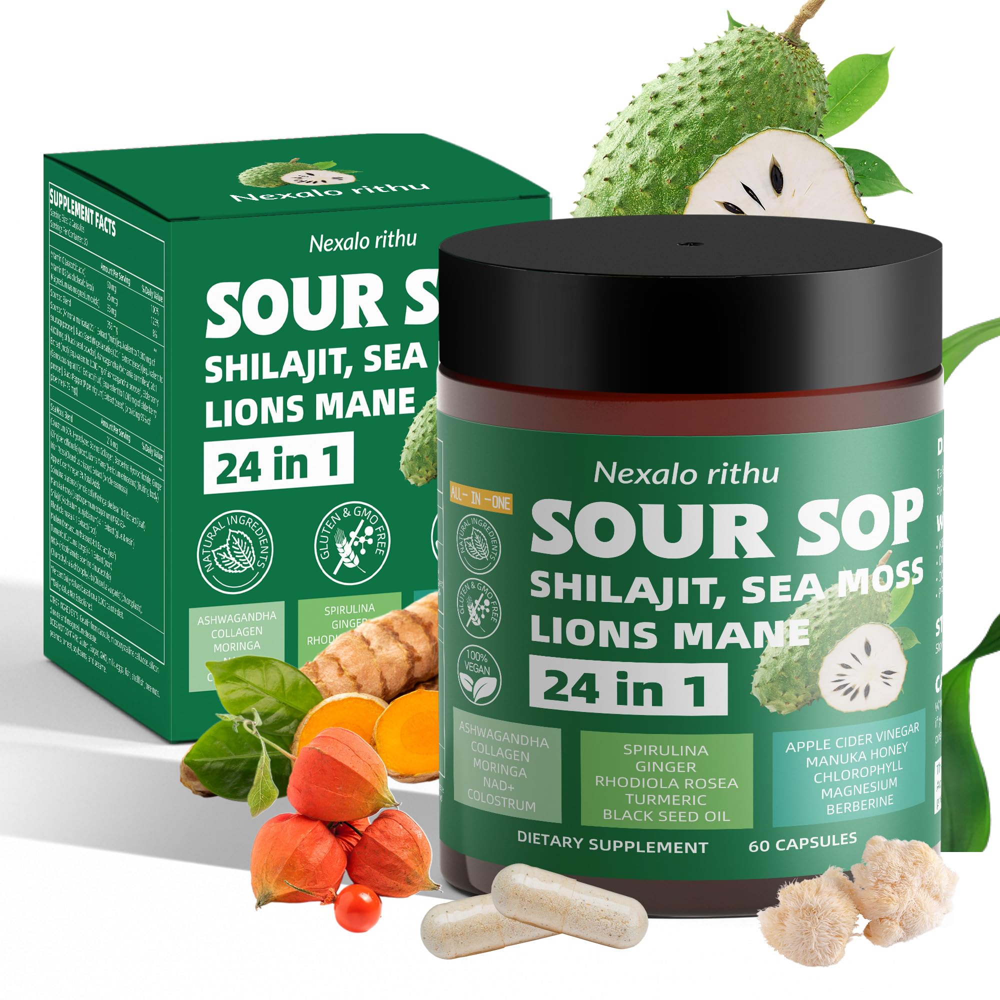 Soursop Capsules 24-in-1 Soursop Bitters & Herbal Soursop Supplement with Sea Moss Moringa Rhodiola Rosea Shilajit & Ashwagandha for Gut Support Energy Immune & Digestive Support Non-GMO Organic