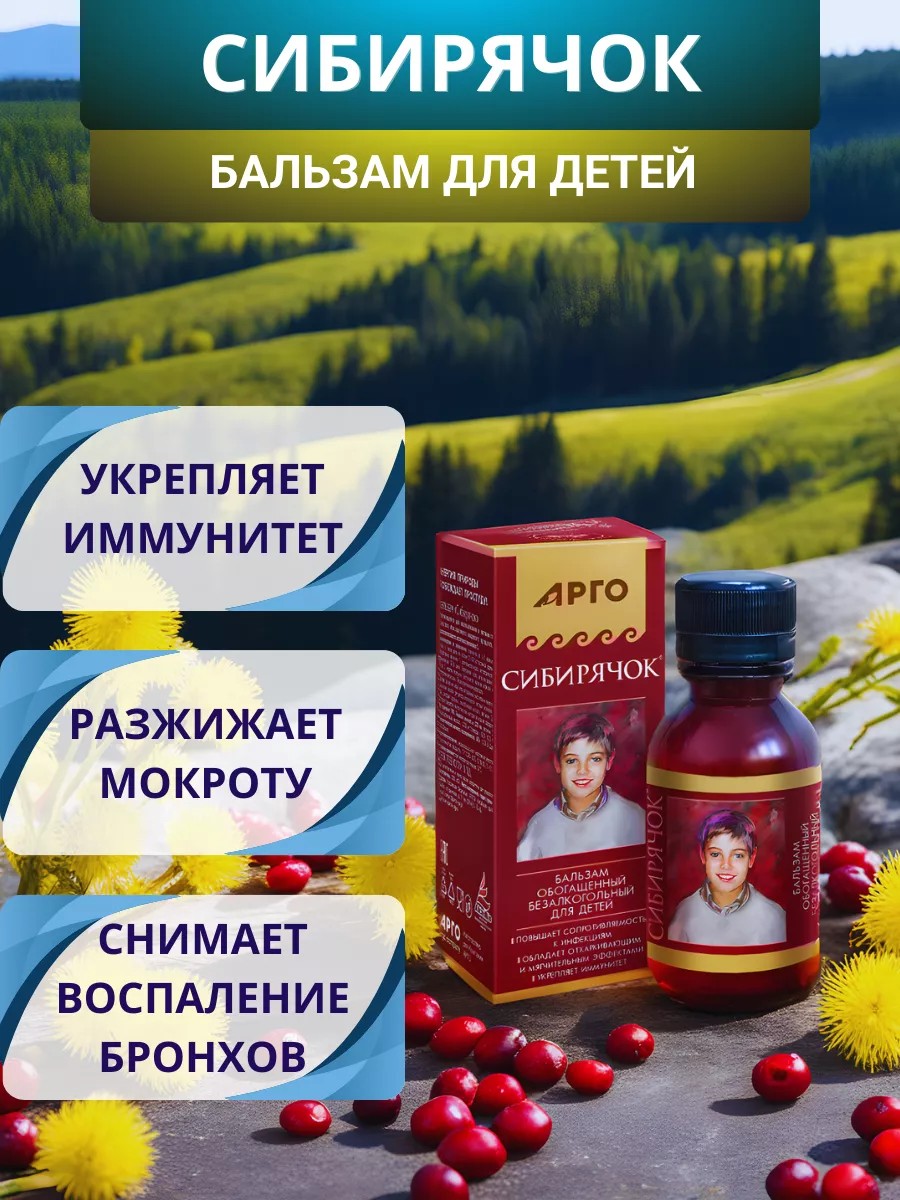 Бальзам «Сибирячок» рекомендуется детям в период простуды для устранения ее симптомов и предупреждения перехода в хроническую форму. Бальзам хорошо зарекомендовал себя как профилактическое средство от инфекционных и вирусных заболеваний, применение которого значительно снижает вероятность и возникновения. Компоненты бальзама подобраны таким образом, что взаимно дополняют положительное действие друг друга. В бальзаме отсутствуют консерванты и красители, нет спирта – экстракты плодов и трав изготовлены на водной основе, все это делает использование бальзама «Сибирячок» безопасным.