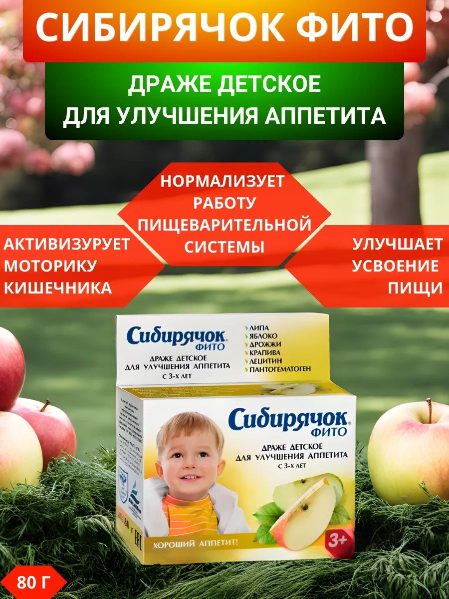 The components of children's dragee Sibiryachok phyto Good appetite improve motility and absorption capacity of the intestine, stimulate the absorption of food, regulate natural metabolism, have a general strengthening effect action.