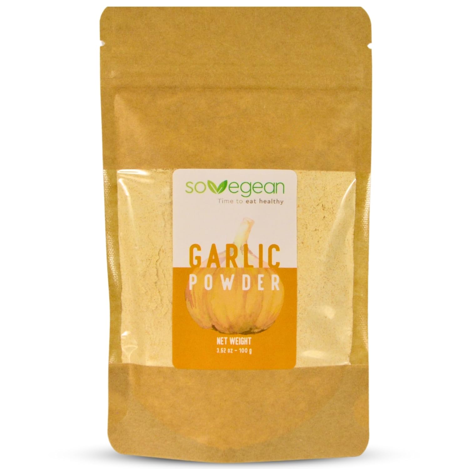 A kraft pouch of SOVEGEAN Garlic Powder, placed on a textured garlic powder background.