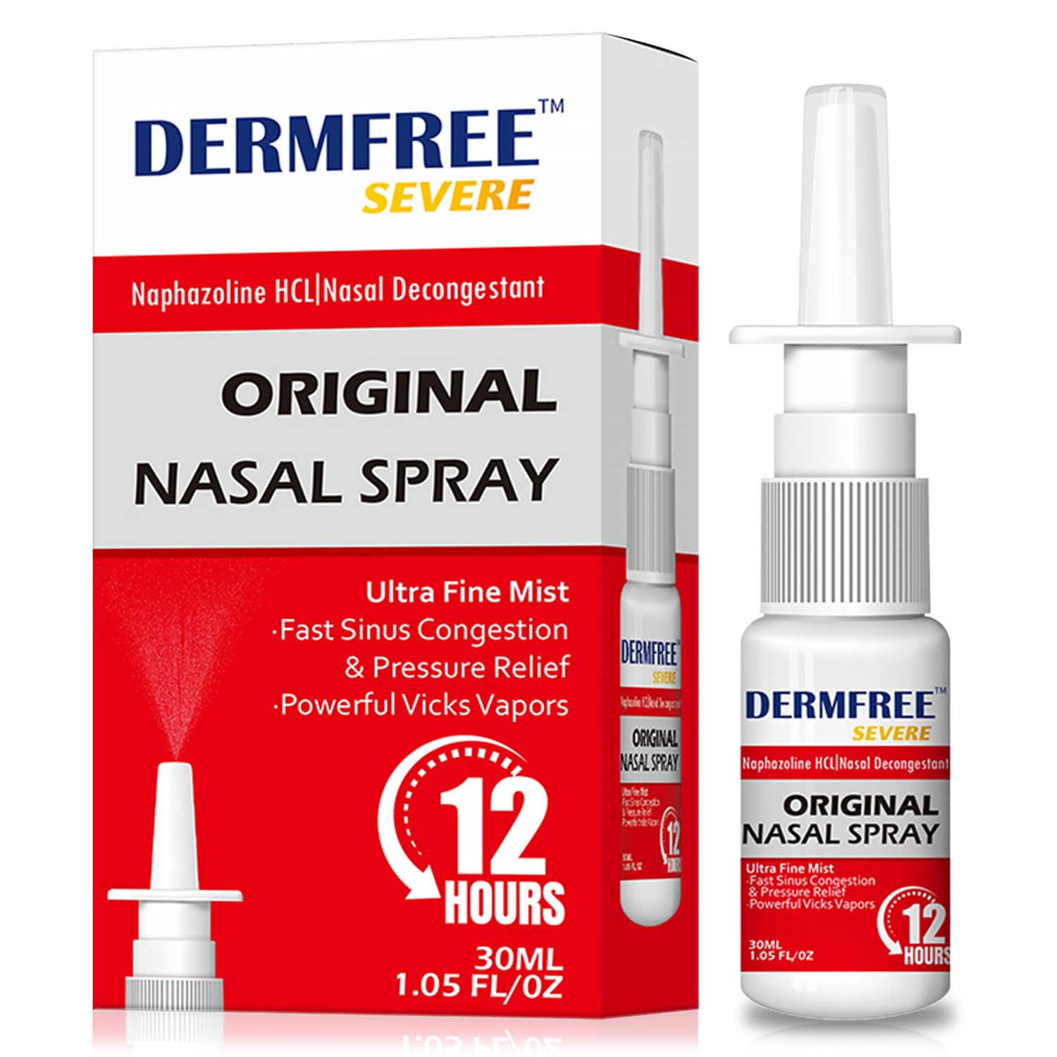 NASAL DECONGESTANTS FOR ADULTS: Use as directed, for Adults and children ages 6 (with adult supervision). SINUS RELIEF ALLERGY RELIEF: Powerful relief from nasal and sinus congestion due to common cold, hay fever, and other respiratory allergies. Not intended for daily use. NOSE SPRAY SINUS MEDICINE FOR SINUS RELIEF: Unlike nasal decongestant tablets, DERMFREE nasal spray applies a targeted nasal mist directly to your nasal passages to help clear sinus congestion fast. 12H CARE FOR YOUR BREATHING: A blast of Naphazoline HCL 0.05 , a powerful topical nasal decongestant, and a cooling menthol sensation that starts working immediately and provides nasal and sinus congestion relief for up to 12 hours. DERMFREE NASAL SPRAY: DERMFREE Max Severe Nasal Congestion Relief helps relieve nasal congestion, sinus congestion, and sinus pressure. Targets nasal congestion and sinus pressure at the source by reducing swelling in the sinuses.
