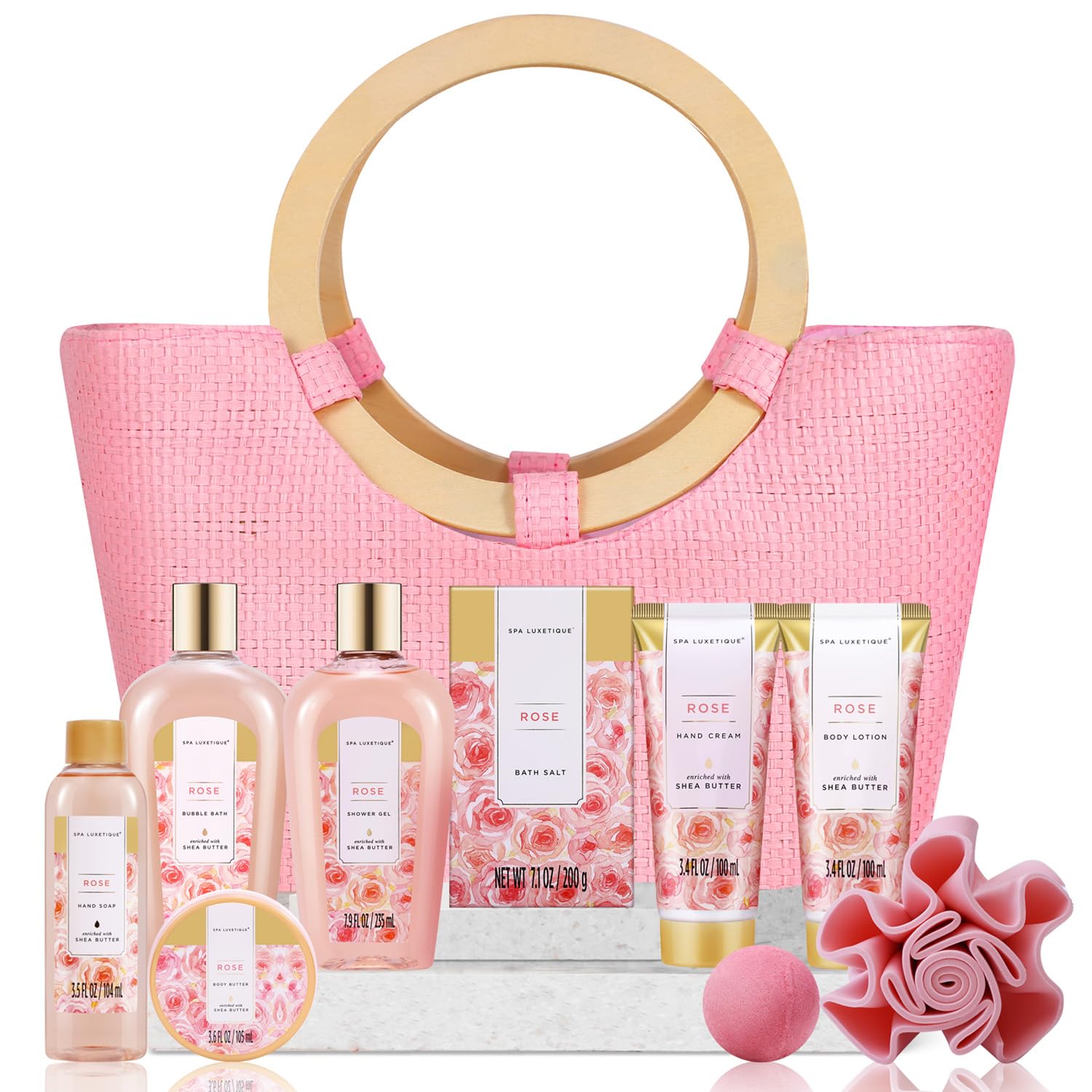 Spa Luxetique Rose Spa Gift Baskets for Women 10pc Bath Gift Set- Pink Tote Bag with Wooden Handles Shower Gel Bubble Bath Bath Bombs Christmas & Birthday Gift Idea