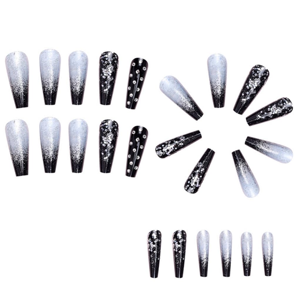 Spactz Black Gradient Applique Diamond False Nails Long Coffin Nail Tips Glitter Diamond Nails Nail Art