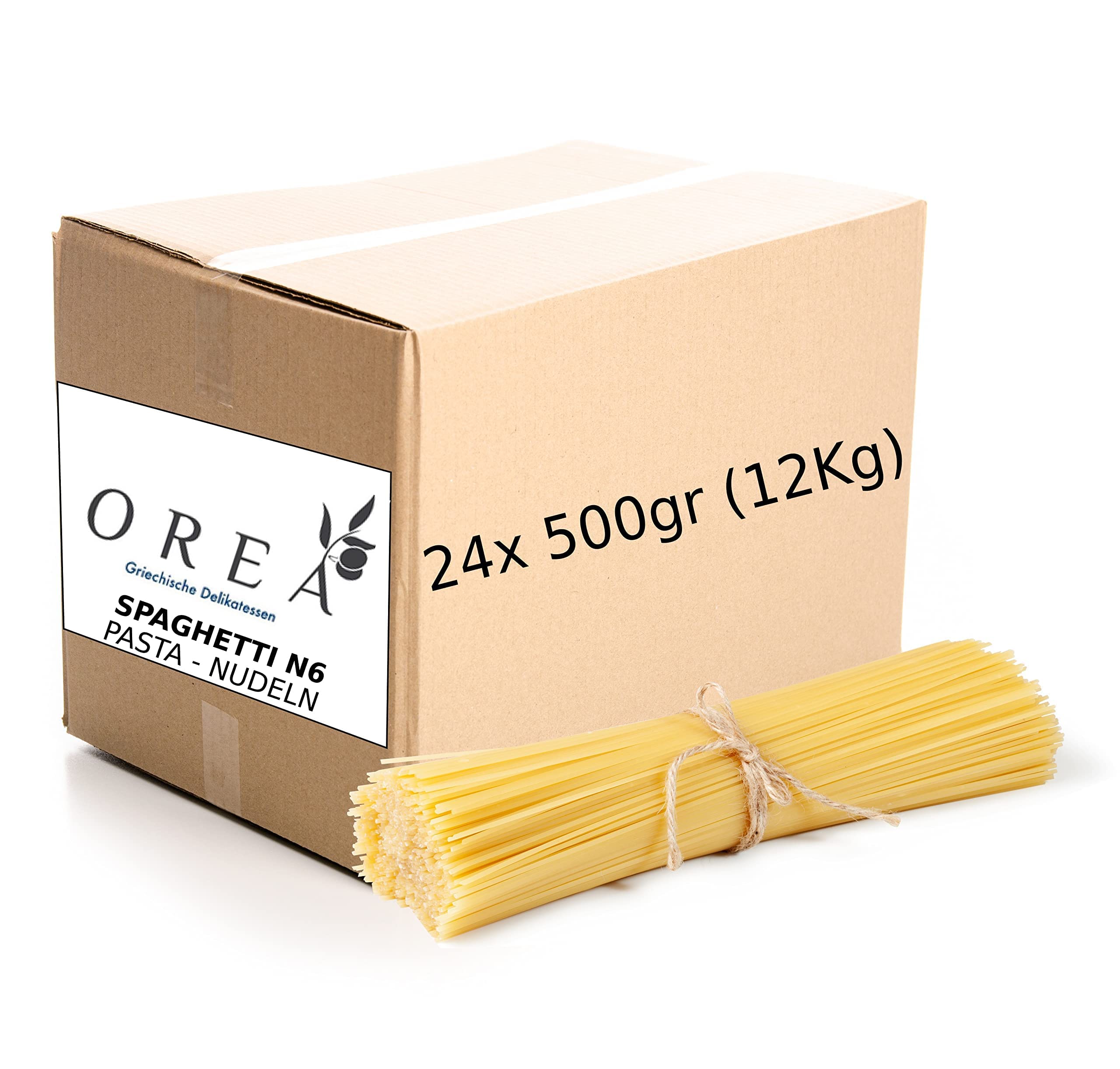 Spaghetti in the box individually packaged on: 24 x 500g.A total of 12kg pasta pasta - N.6 size - produced in Greece.Fits perfectly with all popular pasta dishes and for a very special taste experience - e.g. Bolognese, carbonara, pesto.etc. Experience Italian taste with spaghetti n.6.100 high quality durum wheat and water.