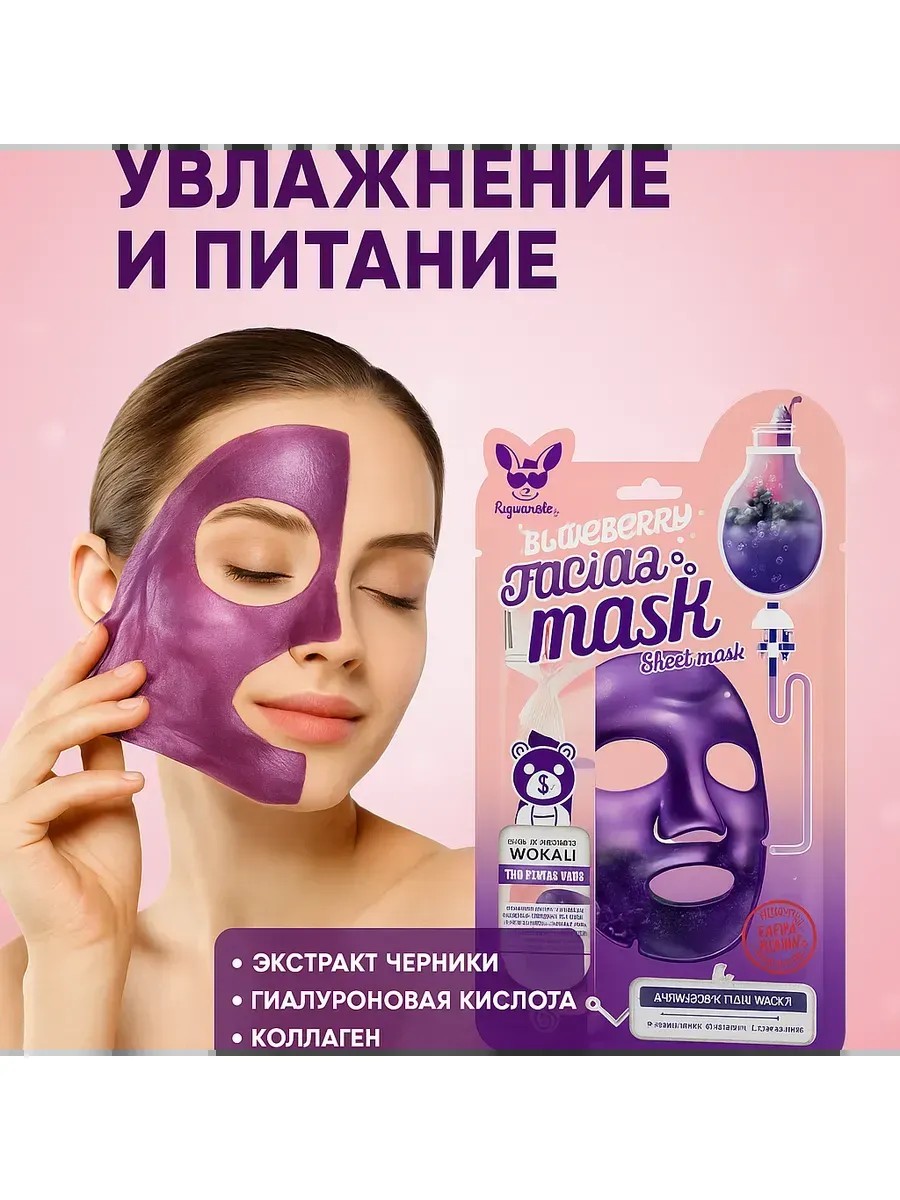 Using the Blueberry Wokali sheet mask provides the effect of a salon procedure in just 15-20 minutes.