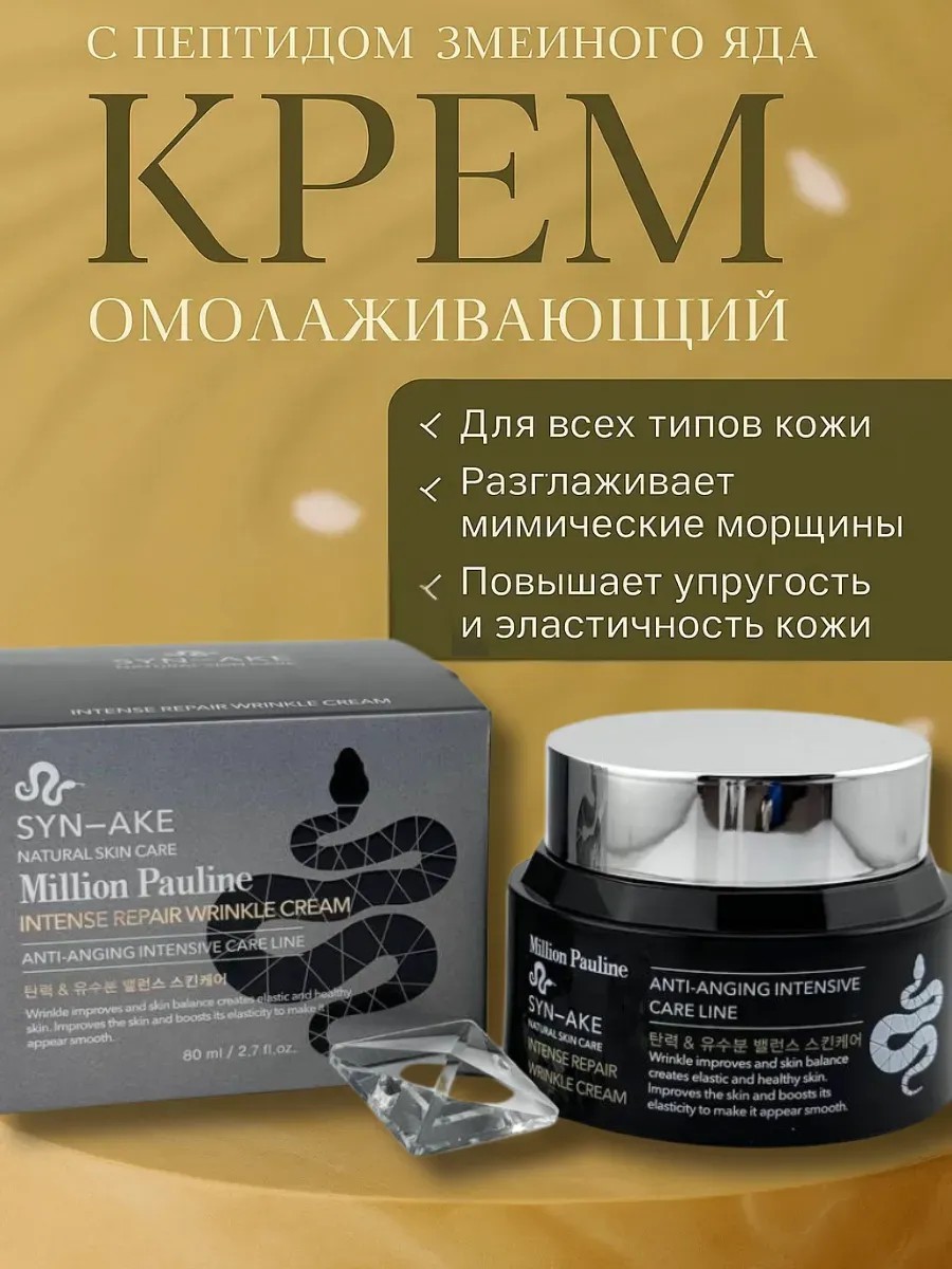 Инновационный крем с синтетическим пептидом Syn-ake, действие которого подобно змеиному яду гадюки снижает уровень работы мимической мускулатуры. Этот компонент безопасно воздействует на кожу лица, позволяет без применения уколов или хирургического вмешательства заметно омолодить кожу, разгладить морщины и предупредить появление новых. Syn-Ake – синтетический пептид, по своему действию похожий на действие яда храмовой гадюки. Подобно тому, как парализуются мышцы человека после укуса змеи, пептид Syn-Ake блокирует нервные импульсы, благодаря чему мышцы лица не сокращаются, происходит их расслабление. Молекулы Syn-Ake легко достигают нервно-мышечных окончаний и иммобилизуют сокращения мышц лица на 82% в течение 2 часов.