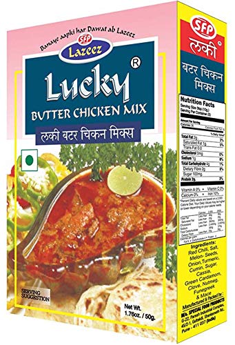 Lucky Butter Chicken Masala is a readymade Indian Spice Mix for making delicious juicy chicken curry in a rich tomato and butter sauce. Lucky Butter Chicken Spice has an easy to follow recipe printed on the back of the box to enjoy that restaurant style aromatic Butter Chicken. Add the best flavor to your dish with low sodium no MSG no artificial flavor. CONTACTINFORMATIE FABRIKANT customerservice luckymasale.comLucky Butter Chicken Masala, Recept Kruidenmix, 50 g [pak van 3] - Geen MSG Laag natriumgehalte Geen kunstmatige kleuren … Lucky Butter Chicken Masala is a readymade Indian Spice Mix for making delicious juicy chicken curry in a rich tomato and butter sauce. Lucky Butter Chicken Spice has an easy to follow recipe printed on the back of the box to enjoy that restaurant style aromatic Butter Chicken. Add the best flavor to your dish with low sodium no MSG no artificial flavor. CONTACTINFORMATIE FABRIKANT customerservice luckymasale.com