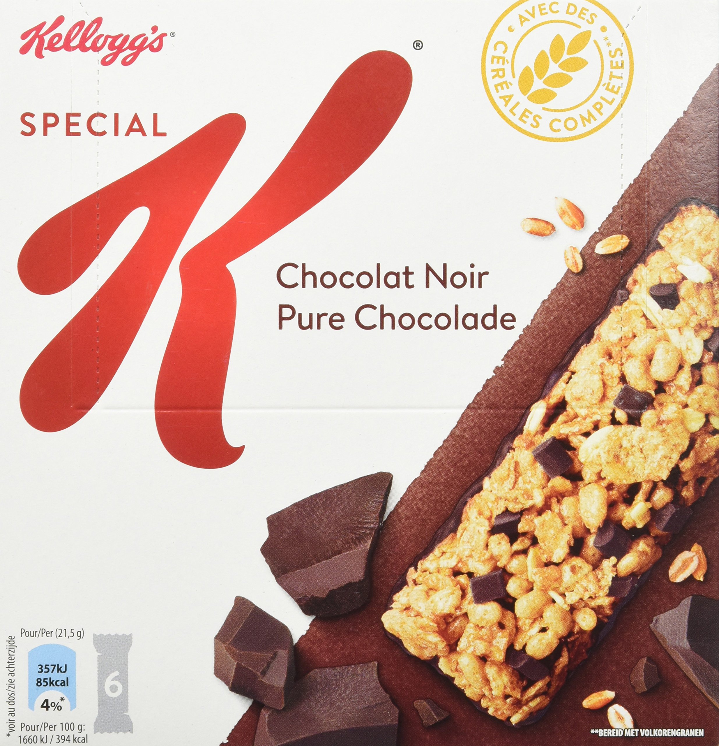 At the office, take a break with Special K. Cereal bar with pieces of dark chocolate on a thin layer of dark chocolate, enriched with vitamins (b1, b2, b3 pp, b6, b9, b12) and iron. For your health, avoid eating too fatty, too sweet, too salty. Kellogg's Produits Alimentaires S.A.S. Immeuble Neptune - 1, rue Galilée - 93160 Noisy-le-Grand INGREDIENTS Ingredients: kellogg's special k cereals (35 ) (rice, whole wheat, sugar, barley, malted barley flour, barley malt flavor, salt, vitamins {b3 pp, b6, b2, b1, b9, b12, d}, iron), glucose syrup, chocolate (14 ) (sugar, cocoa paste, cocoa butter, emulsifiers {soy lecithin, e476}, flavor), sugar, rice, fructose, dextrose, low-fat cocoa powder, chocolate pieces (2.5 ) (sugar, cocoa mass, cocoa butter, emulsifier {soy lecithin}), cocoa mass, humectants (sorbitol, glycerol), palm oil, flavor, calcium carbonate, salt, emulsifier (soy lecithin), milk, antioxidant (e320). Allergens: see ingredients in capital letters. Allergens: WHEAT, BARLEY, MILK, SOY. DIRECTIONS FOR USE Store in a dry place. DISCLAIMER Non-contractual photography. The above indications are given for information purposes. They are not necessarily exhaustive and cannot replace the information appearing on the product packaging which alone is authentic, and to which you are invited to refer, particularly in the event of food intolerance. 6 bars, 130g. Au bureau, adoptez la pause avec Special K. Barre de céréales avec des morceaux de chocolat noir sur une fine couche de chocolat noir, enrichie en vitamines (b1, b2, b3 pp, b6, b9, b12) et en fer. Pour votre santé, évitez de manger trop gras, trop sucré, trop salé. Kellogg's Produits Alimentaires S.A.S. Immeuble Neptune - 1, rue Galilée - 93160 Noisy-le-Grand INGRÉDIENTS Ingrédients : céréales kellogg's special k (35 ) (riz, ble complet, sucre, orge, farine d'orge maltée, arôme de malt d'orge, sel, vitamines {b3 pp, b6, b2, b1, b9, b12, d}, fer), sirop de glucose, chocolat (14 ) (sucre, pâte de cacao, beurre de cacao, émulsifiants {lécithine de soja, e476}, arôme), sucre, riz, fructose, dextrose, cacao maigre en poudre, morceaux de chocolat (2,5 ) (sucre, pâte de cacao, beurre de cacao, émulsifiant {lécithine de soja}), pâte de cacao, humectants (sorbitol, glycérol), huile de palme, arôme, carbonate de calcium, sel, émulsifiant (lécithine de soja), lait, antioxydant (e320). Allergènes : voir les ingrédients en majuscules. Allergènes : BLE, ORGE, LAIT, SOJA. MODE D'EMPLOI A conserver dans un endroit sec. CLAUSE DE NON-GARANTIE Photographie non contractuelle. Les indications ci-dessus sont données à titre d'information. Elles ne sont pas forcément exhaustives et ne sauraient se substituer aux informations figurant sur l'emballage du produit qui font seules foi, et auxquelles vous êtes invités à vous reporter, notamment en cas d'intolérance alimentaire. Les 6 barres, 130g.