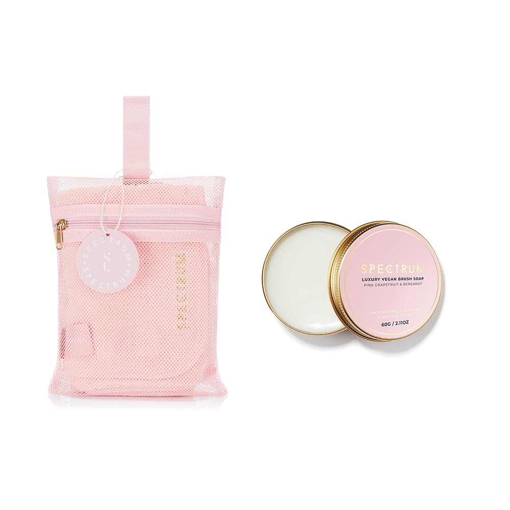 Spectrum Collections Pink Make Up Brush Cleaning Launderette Microfibre Brush Drying Towel for 32 Brushes and Make Up Brush Cleansing Soap with Silicone Cleaning Pad Pink Grapefruit and Bergamot