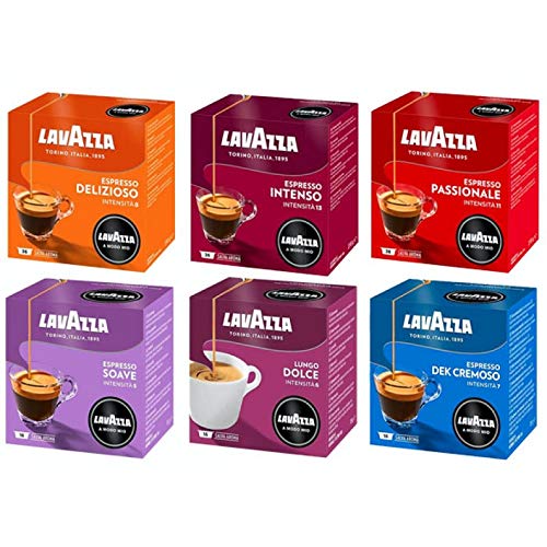 Sperax Lavazza A Modo Mio Pack D couvertes 6 Boites de 16 Capsules Assorted Delisiozo Dek Cremoso Intenso Passionale Lungo Dolce Espresso Soave caf Original 96 Capsules