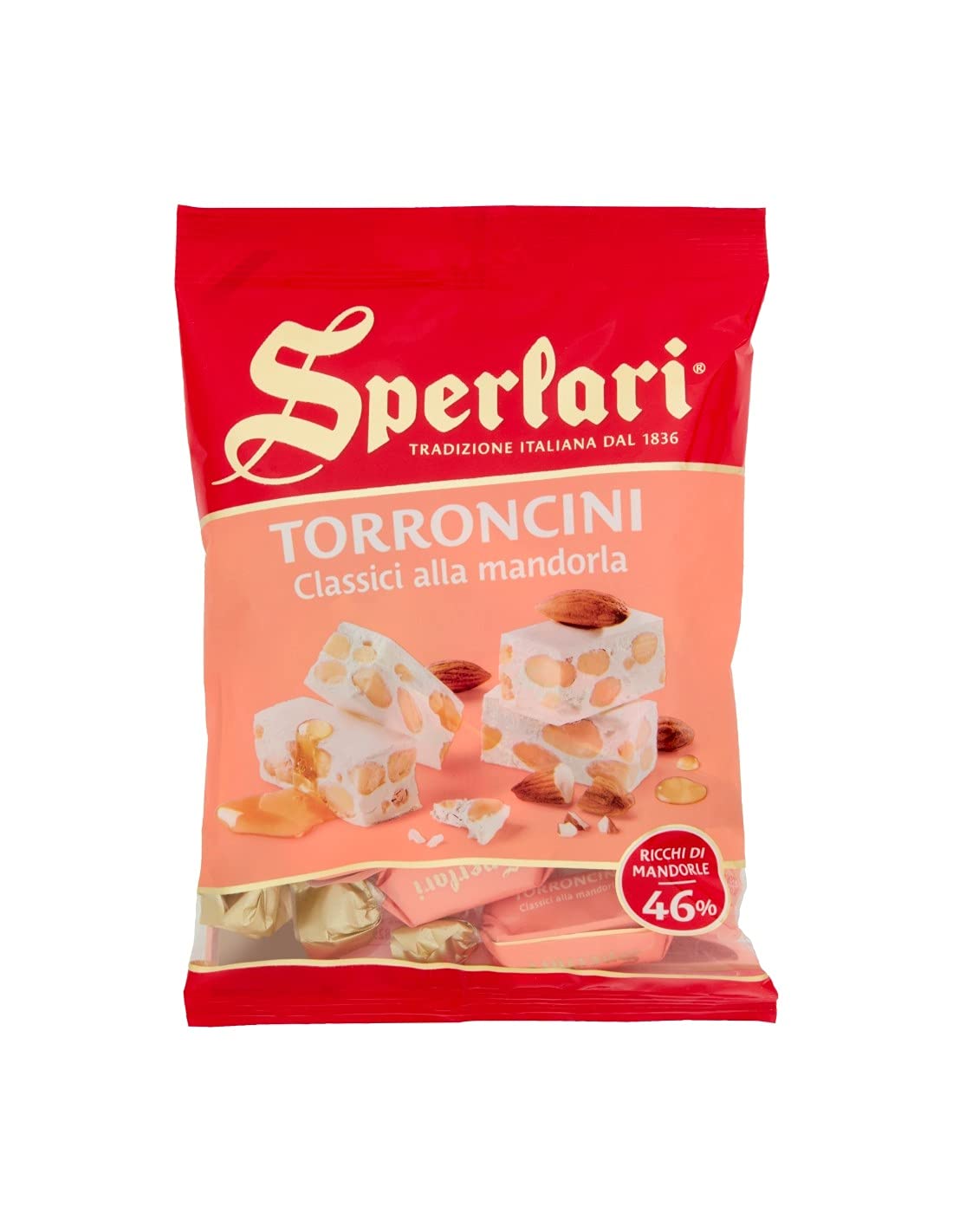 Our classic almond nougatines in a 117 gram bag. A delicate almond fragrance illuminated by exuberant vanilla, with a light note of floral honey. INGREDIENTS almonds (46 ), honey (26 ), sugar, glucose syrup, glucose-fructose syrup, wafers (potato starch, water), egg white, flavoring. May contain other nuts, milk, soy.This product is gluten-free. Ideal for all celebrations: Christmas, birthdays, Halloween, dinners with friends. make every occasion unique. Always carry them with you: every occasion is perfect for enjoying a Torroncino Sperlari, alone or in company. Inside the package, you will find 117 grams of Classic Torroncini with Almond, individually wrapped. Torroncini Sperlari of refined sweetness, rich in honey and fragrant almonds (46 ). Crystal-clear friability: first a meeting of delicate crunchy almonds and a heart with an enveloping vanilla scent, and finally a very sweet honey. Nos nougatines classiques aux amandes en sachet de 117 grammes. Une délicate fragrance d'amandes illuminée par une vanille exubérante, avec une légère note de miel fleuri. INGRÉDIENTS amandes (46 ), miel (26 ), sucre, sirop de glucose, sirop de glucose-fructose, oublies (fécule de pomme de terre, eau), blanc d'œuf, arôme. Peut contenir autres fruits à coque, lait, soja.Ce produit est sans gluten. Idéal pour toutes les fêtes : Noël, anniversaires, Halloween, dîners entre amis. rendez chaque occasion unique. Emportez-les toujours avec vous : chaque occasion est parfaite pour déguster un Torroncino Sperlari, seul ou en compagnie. À l'intérieur de l'emballage, vous trouverez 117 grammes de Torroncini Classiques à l'Amande, emballés individuellement. Torroncini Sperlari de douceur raffinée, riches en miel et en amandes parfumées (46 ). Friabilité cristalline : d'abord une rencontre de délicates amandes croquantes et un cœur au parfum vanillé enveloppant, et enfin un miel très doux.