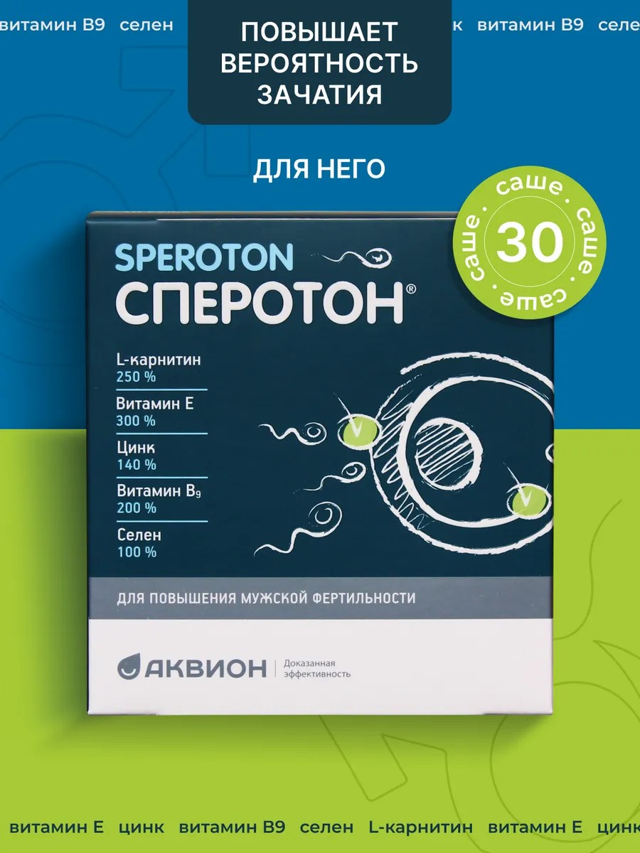Сперотон предназначен для увеличения мужской фертильности и повышения качества спермы. Сперотон прошел 12 клинических исследований, которые подтвердили эффективность его приема для увеличения объема эякулята, концентрации сперматозоидов в сперме, повышения подвижности сперматозоидов и количества сперматозоидов с правильным строением. За счет улучшения качества спермы Сперотон повышается вероятность зачатия: на 15 % при 3-месячном курсе приема; на 26,7 % при 6-месячном курсе приема. Сперотон может применять в период подготовки мужчины к ЭКО для увеличения количества жизнеспособных сперматозоидов правильного строения.L-карнитин увеличивает подвижность сперматозоидов, улучшает их строение, стимулирует сперматогенез за счет чего увеличивается концентрация сперматозоидов. Витамин Е защищает созревающие сперматозоиды от свободных радикалов, улучшает состояние яичек, за счет чего созревает больше подвижных сперматозоидов. Фолиевая кислота (витамин В9) критично необходима для созревания сперматозоидов, от нее зависит правильное строение сперматозоидов. Цинк участвует в синтезе основного мужского гормона – тестостерона и, следовательно, необходим для нормальной работы мужской половой системы. Селен повышает концентрацию и подвижность сперматозоидов, положительно влияет на либидо. Сперотон выпускается в форме порошка для приготовления напитка, расфасованного в порционные саше. Это позволяет свести к минимуму количество вспомогательных веществ.1 упаковка = 1 месяц приема. Мужчинам следует принимать 1 раз в день во время еды, растворив содержимое саше пакета в 1 стакане 200 мл воды. Продолжительность приема 1 месяц.