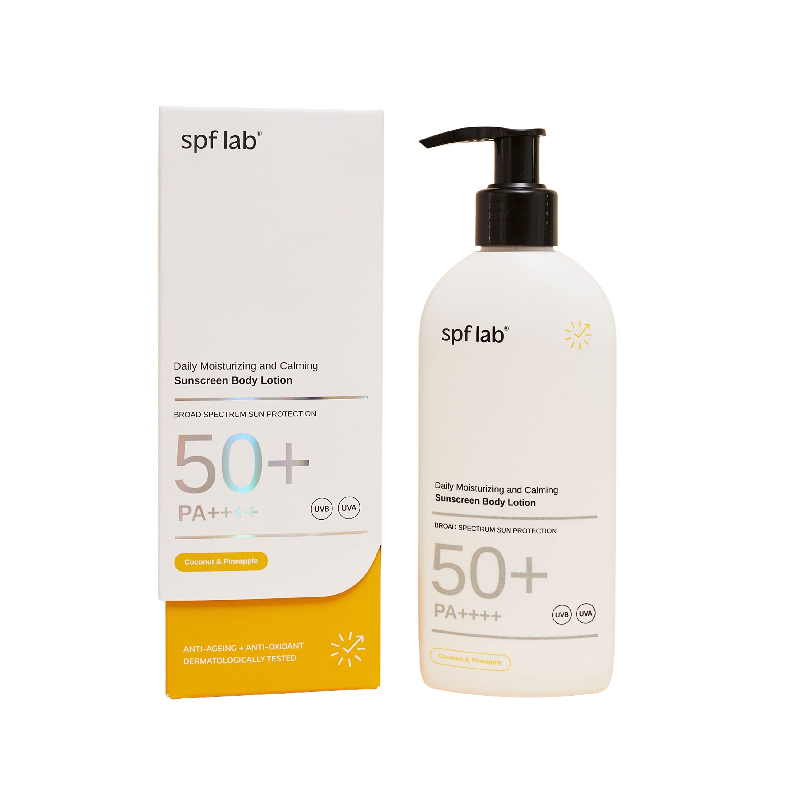This isn't just another average, boring daily sunscreen. Instead, it's a product you'll love, cherish, and use down to the last drop. To make it irresistible, we've combined nourishing antioxidants, premium ingredients, and broad-spectrum UV filters. The delicious fragrances are just the cherry on top. Give your skin the love and protection it deserves with just one click. What makes Coconut Pineapple so irresistible? If you love sweet scents, this one's perfect for you. The Coconut Pineapple fragrance is like a tropical paradise in a bottle, with the sweet, creamy aroma of coconut perfectly complemented by the juicy notes of pineapple. The combination of coconut and pineapple creates a delicious, warm scent that's great for summer or any occasion when you want to feel like you're on a tropical getaway. The antioxidants Centella Asiatica and vitamin E acetate protect your skin against free radicals, which are molecules that can damage cells and contribute to aging. They also benefit your skin by hydrating, moisturizing, soothing, and stimulating collagen production, while also improving your skin barrier. Finally, they possess anti-inflammatory and anti-aging properties, so you can say goodbye to wrinkles and fine lines. Premium ingredients: Hyaluronic acid, glycerin, and panthenol (provitamin B5) provide hydration to your skin, making it plump and reducing the appearance of wrinkles and fine lines caused by dryness. They also improve your skin's elasticity, prevent transepidermal water loss (TEWL), enhance the skin barrier, and reduce inflammation, leaving your skin soft, smooth, and simply beautiful. Sunscreen filters: Ethylhexyl triazone, butyl methoxydibenzoylmethane, methylene bis-benzotriazolyl tetramethylbutylphenol (Nano)No white residue. Non-greasy. Lightweight. PA . SPF 50 .Crème solaire hydratante et apaisante pour le corps - SPF 50 PA - Parfum noix de coco et ananasDESCRIPTION DU PRODUIT Il ne s'agit pas d'une autre crème solaire quotidienne moyenne et ennuyeuse. Au lieu de cela, c'est un produit que vous allez aimer, chérir et utiliser jusqu'à la dernière goutte. Afin de le rendre irrésistible, nous avons combiné des antioxydants nourrissants, des ingrédients de qualité supérieure et des filtres UV à large spectre. Les délicieux parfums sont juste la cerise sur le dessus. En un clic pour donner à votre peau l'amour et la protection qu'elle mérite. Qu'est-ce qui rend la noix de coco et l'ananas irrésistible ? Si vous aimez les parfums sucrés, celui-ci est parfait pour vous. Le parfum noix de coco et ananas est comme un paradis tropical dans une bouteille, avec l'arôme doux et crémeux de noix de coco parfaitement complété par les notes juteuses de l'ananas. La combinaison de noix de coco et d'ananas crée un parfum délicieux et chaleureux qui est excellent pour l'été ou toute occasion où vous voulez vous sentir comme dans une escapade tropicale. Les antioxydants Centella Asiatica et acétate de vitamine E protègent votre peau contre les radicaux libres, qui sont des molécules qui peuvent nuire aux cellules et contribuer au vieillissement. Ils bénéficient également à votre peau en hydratant, hydratant, apaisant et stimulant la production de collagène, tout en améliorant également votre barrière cutanée. Enfin, ils possèdent des propriétés anti-inflammatoires et anti-âge, de sorte que vous pouvez dire adieu aux rides et ridules. Ingrédients de qualité supérieure : l'acide hyaluronique, la glycérine et le panthénol (provitamine B5) fournissent une hydratation à votre peau, ce qui la rend rebondie et réduit l'apparence des rides et ridules causées par la sécheresse. Ils améliorent également l'élasticité de votre peau, empêchent la perte d'eau transépidermique (TEWL), améliorent la barrière cutanée et réduisent l'inflammation, laissant votre peau douce, lisse et tout simplement belle. Filtres de protection solaire : éthylhexyl triazone, butyl méthoxydibenzoylméthane, méthylène bis-benzotriazolyl tétraméthylbutylphenol (Nano)Sans résidus blancs. Non gras. Légères. PA . SPF 50 .
