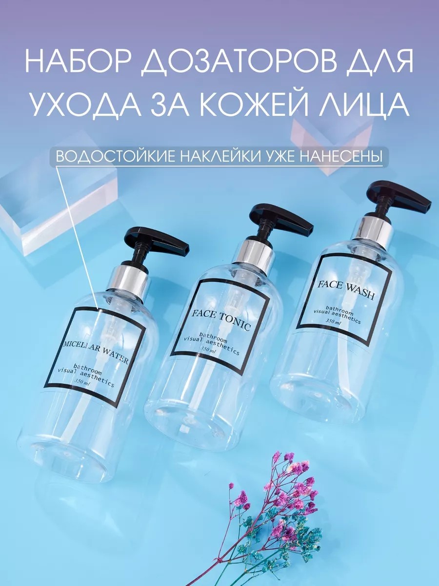 | Комплектация | Флакон с дозатором 350 мл 3 шт; Флакон средство для умывания лица; флакон для мицеллярной воды; Флакон для тоника для лица; Набор органайзеров для косметики |