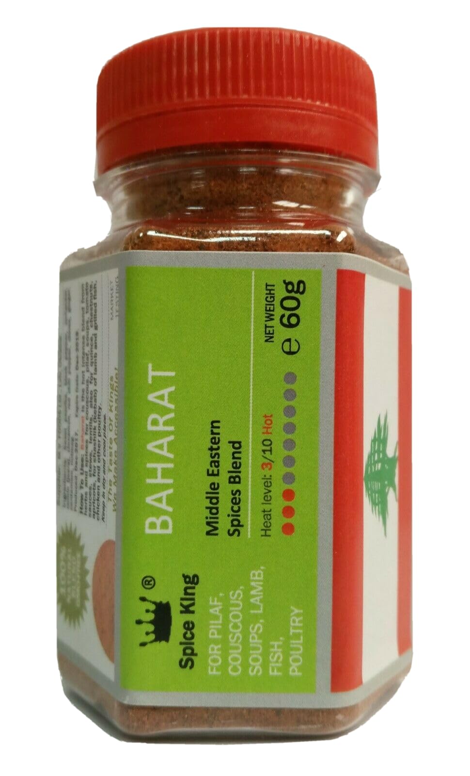 Discover the authentic flavors of the Middle East with this spice mix from Baharat. A versatile seasoning that brings warmth and depth to your dishes, this 60g mix contains a carefully balanced blend of traditional Middle Eastern spices. With a mild heat level of 3 10, it is perfect for those who enjoy subtle heat without overwhelming spiciness. Ideal for enriching pilafs, couscous, soups, lamb dishes and various Middle Eastern specialties. The aromatic blend adds a rich, complex flavor profile to your cooking, making it an essential addition to your spice collection. This handy jar allows for easy storage and dispensing, helping you maintain the freshness of your herbs. Whether you are preparing traditional Middle Eastern dishes or want to add an exotic twist to everyday dishes, this Baharat blend offers the perfect balance of authentic flavors. INGREDIENTS Sweet paprika, black pepper, coriander, cumin (jeera), cinnamon, red chili pepper, cloves, ginger, cardamom, nutmeg. SALT FREE.Spice King Baharat Midden-Oosterse kruidenmix voor pilaf, warmheidsniveau 3 10, 60 g Ontdek de authentieke smaken van het Midden-Oosten met deze kruidenmix van Baharat. Een veelzijdige smaakmaker die warmte en diepte aan uw gerechten brengt, deze mix van 60 g bevat een zorgvuldig uitgebalanceerde mix van traditionele Midden-Oosterse kruiden. Met een mild warmteniveau van 3 10 is het perfect voor diegenen die genieten van subtiele warmte zonder overweldigende kruidigheid. Ideaal voor het verrijken van pilafs, couscous, soepen, lamsgerechten en diverse specialiteiten uit het Midden-Oosten. De aromatische mix voegt een rijk, complex smaakprofiel toe aan uw koken, waardoor het een essentiële aanvulling is op uw kruidencollectie. Deze handige pot zorgt voor eenvoudige opslag en dosering, waardoor u de versheid van uw kruiden kunt behouden. Of u nu traditionele gerechten uit het Midden-Oosten bereidt of een exotische twist wilt toevoegen aan alledaagse gerechten, deze Baharat-blend biedt de perfecte balans tussen authentieke smaken. INGREDIËNTEN Zoete paprika, zwarte peper, koriander, komijn (jeera), kaneel, rode chilipeper, kruidnagel, gember, kardemom, nootmuskaat. ZOUT VRIJ.