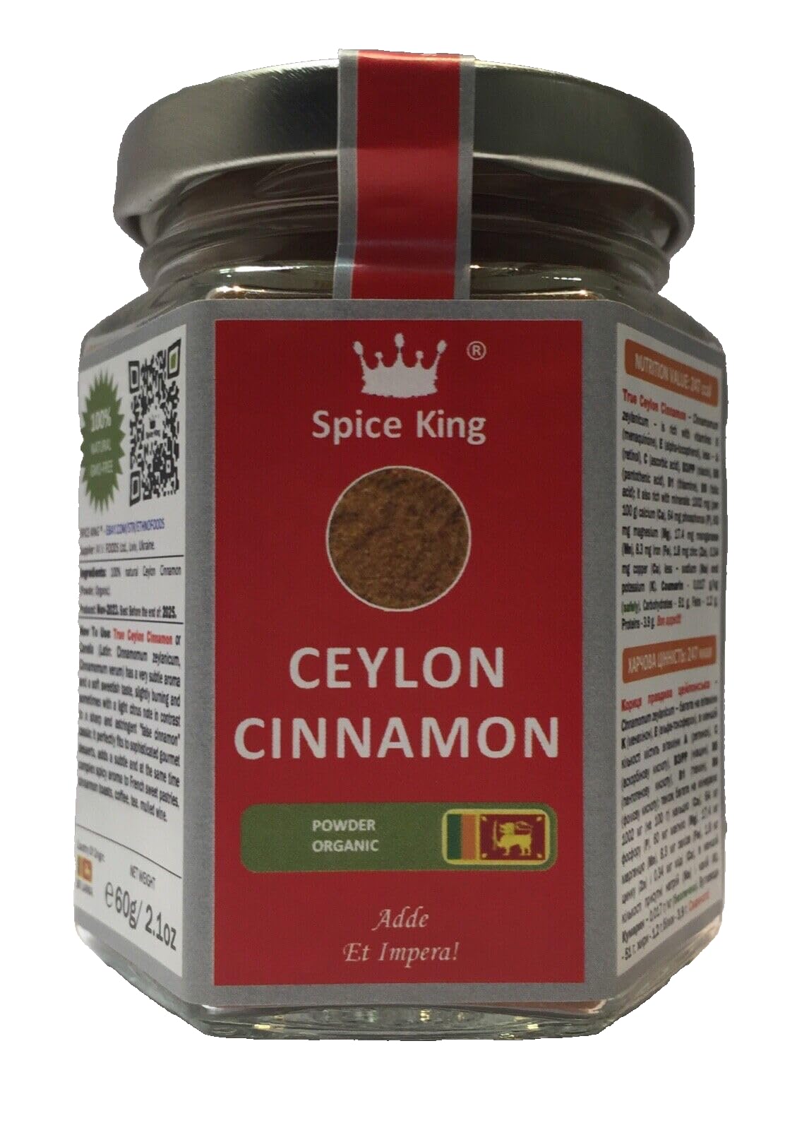 Discover the exquisite taste of real Ceylon cinnamon from Sri Lanka with Spice King's premium organic powder. Carefully sourced from the world's best cinnamon-producing region, this 60g jar contains pure Ceylon cinnamon (Cinnamomum verum), known for its delicate, refined flavor profile that is distinctly different from other varieties. Perfect for both sweet and savory dishes, this versatile spice adds heat to baked goods, curries and hot drinks. The elegant glass jar ensures optimal freshness while you can see the fine powder inside. Whether you are an experienced chef or a home cook, this aromatic spice will elevate your culinary creations with its authentic Sri Lankan heritage. The convenient 60g size is ideal for regular use in the kitchen while retaining the herb's potency and aroma. INGREDIENTS Ceylon Cinnamon PowderSpice King Ceylon kaneelpoeder, 60g glazen pot, Sri Lanka Ontdek de voortreffelijke smaak van echte Ceylon-kaneel uit Sri Lanka met het premium biologische poeder van Spice King. Deze pot van 60 g is zorgvuldig afkomstig uit 's werelds beste kaneelproducerende regio en bevat pure Ceylon-kaneel (Cinnamomum verum), bekend om zijn delicate, verfijnde smaakprofiel dat duidelijk verschilt van andere variëteiten. Perfect voor zowel zoete als hartige gerechten, deze veelzijdige specerij voegt warmte toe aan gebak, curry's en warme dranken. De elegante glazen pot zorgt voor een optimale frisheid terwijl je het fijne poeder erin kunt zien. Of je nu een ervaren chef-kok bent of een thuiskok, deze aromatische specerij zal je culinaire creaties verheffen met zijn authentieke Sri Lankaanse erfgoed. Het handige formaat van 60 g is ideaal voor regelmatig gebruik in de keuken met behoud van de potentie en het aroma van het kruid. INGREDIËNTEN Ceylon Kaneel Poeder