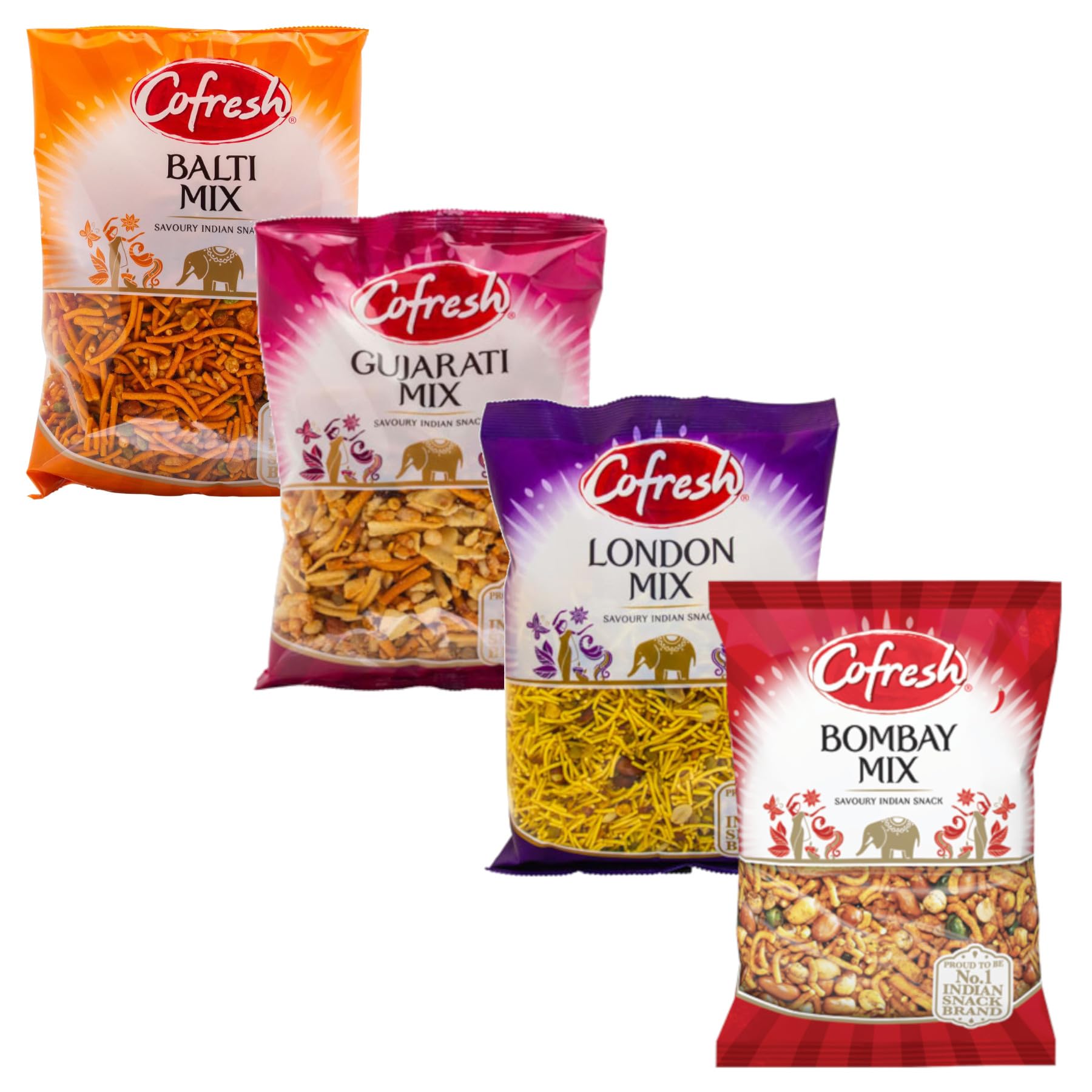 f you love spicy and savoury snacks, you will love this spicy Indian snack mix variety bundle. Contains four packs of 325g each, featuring four different mixes: Balti, Bombay, London and Gujarati. Each mix has its own unique flavour and texture, combining savoury noodles, peas, peanuts and lentils with a variety of spices such as chilli, paprika, cumin, turmeric and garlic. Whether you prefer the mild and tangy London mix, the hot and spicy Bombay mix, the aromatic and crunchy Balti mix, or the sweet and sour Gujarati mix, you will find something to suit your taste buds in this bundle. You can enjoy these snacks on your own, or share them with your friends and family at parties, picnics, movie nights and more. They are perfect for dipping, topping, mixing and munching. Allergen Information: Contains: Peanuts May contain: Sesame Seeds, Soya, Milk and Sulphites Legal Disclaimer Actual product packaging and materials may contain more and different information than what is shown on our app or website. We recommend that you do not rely solely on the information presented here and that you always read labels, warnings, and directions before using or consuming a product. INGREDIENTS Balti Mix: Savoury Noodles 71 (Maize Flour, Pea Flour, Rapeseed Oil, Gram Flour, Potato Starch, Salt, Chilli Powder, Spices), Split Peas 13 (Peas, Rapeseed Oil), Peanuts 7 (Peanuts, Rapeseed Oil, Chilli Powder, Salt), Puffed Rice 3 (Rice, Rapeseed Oil, Turmeric, Salt), Green Lentils 3 (Green Lentils, Rapeseed Oil), Seasoning 3 (Chilli Powder, Rice Flour, Sugar, Salt, Spices (Paprika, Coriander Seed, Cumin, Fenugreek Seed, Turmeric, Cayenne Pepper), Chilli Blend (Chilli, Cumin, Salt, Garlic, Oregano), Onion Powder, Acid (Citric Acid), Acidity Regulator (Sodium Diacetate), Garlic Powder, Tomato Powder, Turmeric Extract (Natural Turmeric Flavouring, Colour (Curcumin)), Natural Flavouring, Rosemary Extract, Colour (Paprika Extract)) Bombay Mix: Savoury Noodles 71 (Maize Flour, Pea Flour, Rapeseed Oil, Gram Flour, Potato Starch, Salt, Chilli Powder, Spices), Split Peas 13 (Peas, Rapeseed Oil), Peanuts 7 (Peanuts, Rapeseed Oil, Chilli Powder, Salt), Puffed Rice 3 (Rice, Rapeseed Oil, Turmeric, Salt), Green Lentils 3 (Green Lentils, Rapeseed Oil), Seasoning 3 (Chilli Powder, Rice Flour, Sugar, Salt, Spices (Paprika, Coriander Seed, Cumin, Fenugreek Seed, Turmeric, Cayenne Pepper), Chilli Blend (Chilli, Cumin, Salt, Garlic, Oregano), Onion Powder, Acid (Citric Acid), Acidity Regulator (Sodium Diacetate), Garlic Powder, Tomato Powder, Turmeric Extract (Natural Turmeric Flavouring, Colour (Curcumin)), Natural Flavouring, Rosemary Extract, Colour (Paprika Extract)) London Mix: Savoury Noodles 71 (Maize Flour, Pea Flour, Rapeseed Oil, Gram Flour, Potato Starch, Salt, Chilli Powder, Spices), Lentils 13 (Lentils, Rapeseed Oil), Peanuts 7 (Peanuts, Rapeseed Oil, Chilli Powder, Salt), Spice 3 (Rapeseed Oil, Chilli Powder, Salt, Spices), Seasoning 6 (Sugar, Rice Flour, Salt, Spices (Paprika, Coriander Seed, Cumin, Fenugreek Seed, Turmeric, Cayenne Pepper), Chilli Blend (Chilli, Cumin, Salt, Garlic, Oregano), Onion Powder, Acid (Citric Acid), Acidity Regulator (Sodium Diacetate), Garlic Powder, Tomato Powder, Turmeric Extract (Natural Turmeric Flavouring, Colour (Curcumin)), Natural Flavouring, Rosemary Extract, Colour (Paprika Extract)) Gujarati Mix: Savoury Noodles 71 (Maize Flour, Pea Flour, Rapeseed Oil, Gram Flour, Potato Starch, Salt, Chilli Powder, Spices), Split Peas 13 (Peas, Rapeseed Oil), Peanuts 7 (Peanuts, Rapeseed Oil, Chilli Powder, Salt), Puffed Rice 3 (Rice, Rapeseed Oil, Turmeric, Salt), Green Lentils 3 (Green Lentils, Rapeseed Oil), Seasoning 3 (Chilli Powder, Rice Flour, Sugar, Salt, Spices (Paprika, Coriander Seed, Cumin, Fenugreek Seed, Turmeric, Cayenne Pepper), Chilli Blend (Chilli, Cumin, Salt, Garlic, Oregano), Onion Powder, Acid (Citric Acid), Acidity Regulator (Sodium Diacetate), Garlic Powder, Tomato Powder, Turmeric Extract (Natural Turmeric Flavouring, Colour (Curcumin)), Natural Flavouring, Rosemary Extract, Colour (Paprika Extract))Enjoy these snacks as they are, or pair them with your favourite dips, sauces, salads or sandwiches for a more filling meal. Suitable for vegetarians and vegans. Satisfying snacks, great for sharing with your friends and family at parties, picnics, movie nights and more. With a mix of savoury noodles, peas, peanuts and lentils, seasoned with spices such as chilli, paprika, cumin, turmeric and garlic. Spice up your snacking with this variety bundle of four delicious mixes: Balti, Bombay, London and Gujarati, each with its own distinctive flavour and crunch.