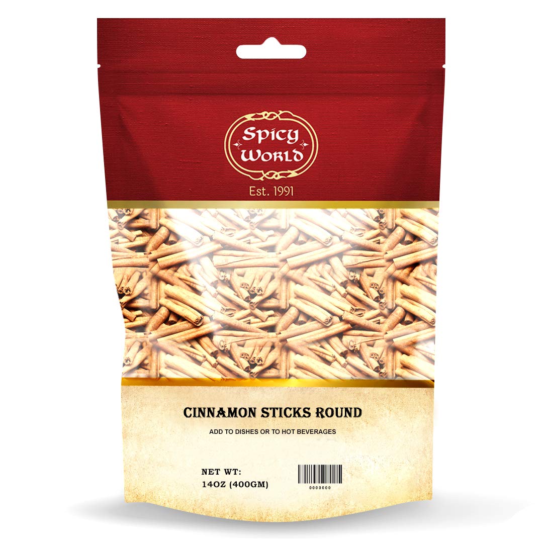 Spicy World has been selling spices for over 30 years, buy with confidence!Net Weight: 400g (14oz) - large bag that lasts a long time. Product of India Alternative Name (Indian) Dalchini Sabat. ?Packed in a beautiful resealable bag for easy storage and convenience. Contains about 44-50 Sticks 3.25 Inches in Length Cassia Cinnamon (Depending on thickness). 100 Natural, No preservatives or "fillers" or artificial colors. We're sure you're going to love our Round Cinnamon Sticks by Spicy World:.