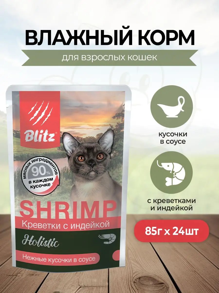 Влажный корм для кошек "Креветки с индейкой" - настоящая жемчужина линейки Blitz Holistic. Изысканный вкус креветок оттеняется диетическим мясом индюшек и пикантным ароматом мясных субпродуктов. Это очень полезная и питательная смесь, которая усваивается кошками практически на 100%! креветка и индейка (не менее 20%), мясные субпродукты (в т.ч. печень, почки), горох (не более 2,2%), рыбий жир, экстракт топинамбура, экстракт Юкки Шидигера, витамины и минеральные вещества, таурин.Сырой белок 8,00 %, Сырой жир 4,00 %, Сырая зола 2,00 %, Сырая клетчатка 0,30 %, Влажность 84,00 %, Витамин А 3980 МЕВитамин D3 14,7 МЕВитамин Е 1 мгТаурин 77 мгКальций 0,23 мгФосфор 0,16 мгМагний 60 мгЦинк 2 мгНатрий 110 мгЭнергетическая ценность 66 ккал/278 кДж