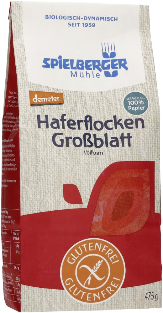 Flavor: Storage and use: Store in a cool, dry place. Processing: Our gluten-free oats are carefully separated from all gluten-containing products from cultivation to sale in the store and are analyzed multiple times. To ensure that the gluten content is reliably below 20 ppm 20 mg kg gluten, the farmer must avoid contamination during cultivation planning, harvesting, storage, and transport. At our mill, we ensure strictly separated flows of goods. Only when the final analysis confirms gluten-freeness do the products leave our premises. For an ecological and safe packaging solution for our gluten-free products, we use glassine paper. This is very dense and has a greaseproof barrier. For our bags for gluten-free products, we use a complete inner bag made of this paper. This offers sufficient protection against subsequent contamination. Because it is made of 100 paper, it can be easily disposed of with the paper recycling system. For our gluten-free oatmeal, the whole grain is darned, steamed, and then rolled into a beautiful flake. This preserves all the ingredients of the whole grains. Oats are a true superfood, offering many vitamins and minerals such as B vitamins, vitamin E, potassium, iron, and zinc. Furthermore, the grain boasts a high protein content and satisfying fiber. Oats are particularly rich in the fiber beta-glucan. This makes them exceptionally healthy, as beta-glucan has a positive effect on cholesterol and blood sugar levels. Processing Preparation: Our oatmeal can be enjoyed without cooking or soaking. Simply mix with yogurt, milk, plant-based alternatives, or juice and enjoy hot or cold. Enhance with fresh fruit, dried fruit, nutmeg, jam, honey, or spices as desired. Besides its classic use as muesli, INGREDIENTS: Large-leaf oat flakes, gluten-free. INSTRUCTIONS: Large-leaf oats can be made into porridge with milk or water. They are also suitable for no-bake cakes. SAFETY WARNING Allergy information: Guaranteed no (with analysis): grains, wheat, cohorasaan wheat, spelt, rye, barley, other grains containing gluten. See moreSpielberger Biologische glutenvrije havermout grootblad, demeter (6 x 475 gr) 475 g (6er Pack) Smaak: Bewaren en gebruik: koel en droog bewaren. Verwerking: onze glutenvrije havermout wordt zorgvuldig gescheiden gehouden van alle glutenhoudende producten van teelt tot verkoop in de winkel en worden meerdere keren geanalyseerd. Om ervoor te zorgen dat het glutengehalte betrouwbaar lager is dan 20 ppm 20 mg kg gluten, moet de boer al bij de teeltplanning, de oogst, de opslag en het transport verontreinigingen vermijden. In onze molen letten we op strikt gescheiden goederenstromen. Pas als de laatste analyse de glutenvrijheid bevestigt, verlaten de producten ons huis. Voor een ecologische en veilige verpakkingsoplossing voor de glutenvrije producten vertrouwen wij op pergamijnpapier. Deze is zeer dicht en heeft een vetbarrière. Bij onze zakjes voor glutenvrije producten gebruiken we een complete binnenzak van dit papier. Hij biedt voldoende bescherming tegen latere verontreiniging. Omdat hij uit 100 papier bestaat, kan hij probleemloos via het oude papier worden weggegooid. Voor onze glutenvrije havermout wordt het hele korrel gedard, gestoomd en vervolgens tot een mooie vlok gewalst. Zo blijven alle ingrediënten van de volle granen behouden. Haver is een echt superfood, want het biedt veel vitaminen en mineralen zoals B-vitaminen, vitamine E, kalium, ijzer en zink. Bovendien scoort het graan met een hoog eiwitgehalte en verzadigende vezels. Bijzonder rijk is haver aan de vezels bèta-glucaan. Dit maakt hem bijzonder gezond, want bèta-glucaan heeft een positief effect op de cholesterol- en bloedsuikerspiegel.Verwerking bereiding: onze havermout kan zonder koken of inweken worden genoten. Gewoon mengen met yoghurt, melk, plantaardige alternatieven of sap en geniet van warm of koud. Naar wens bijvoorbeeld met vers fruit, gedroogde vruchten, notenmoes, jam, honing of specerijen verfijnen. Naast het klassieke gebruik als mueslizut INGREDIËNTEN Havervlokken grootblad, glutenvrij GEBRUIKSAANWIJZING Havermout grootblad kan met melk of water tot pap worden verwerkt. Ze zijn ook geschikt voor taarten zonder bakken. VEILIGHEIDSWAARSCHUWING Allergie-info: Gegarandeerd nee (met analyse): granen, tarwe, cohorasaantarwe, spelt rogge, gerst, andere granen met gluten. Meer bekijken