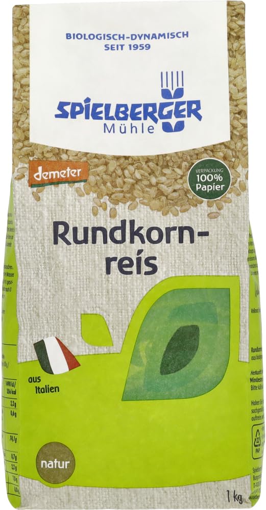 Production: Our rice comes from a farm in Lombardy, in northern Italy. The farm's conversion to Demeter agriculture and the construction of the rice mill in the 1980s were overseen by Hans Spielberger. Today, several Demeter farmers supply their rice to the farm. Organic certification label in the EU. INGREDIENTS Round grain rice, natural INSTRUCTIONS FOR USE Use our round grain rice for rice dishes and gratins. It also has a sweet taste. Basic recipe: Please wash the rice before use. Then let it soak slightly in twice the amount of water. Then boil once in lightly salted water and let it boil for a good 40 minutes. You can find more recipes on our website: www.spielberger.de. It also has a sweet taste. SAFETY WARNING Allergy information: Guaranteed exclusion: gluten See more