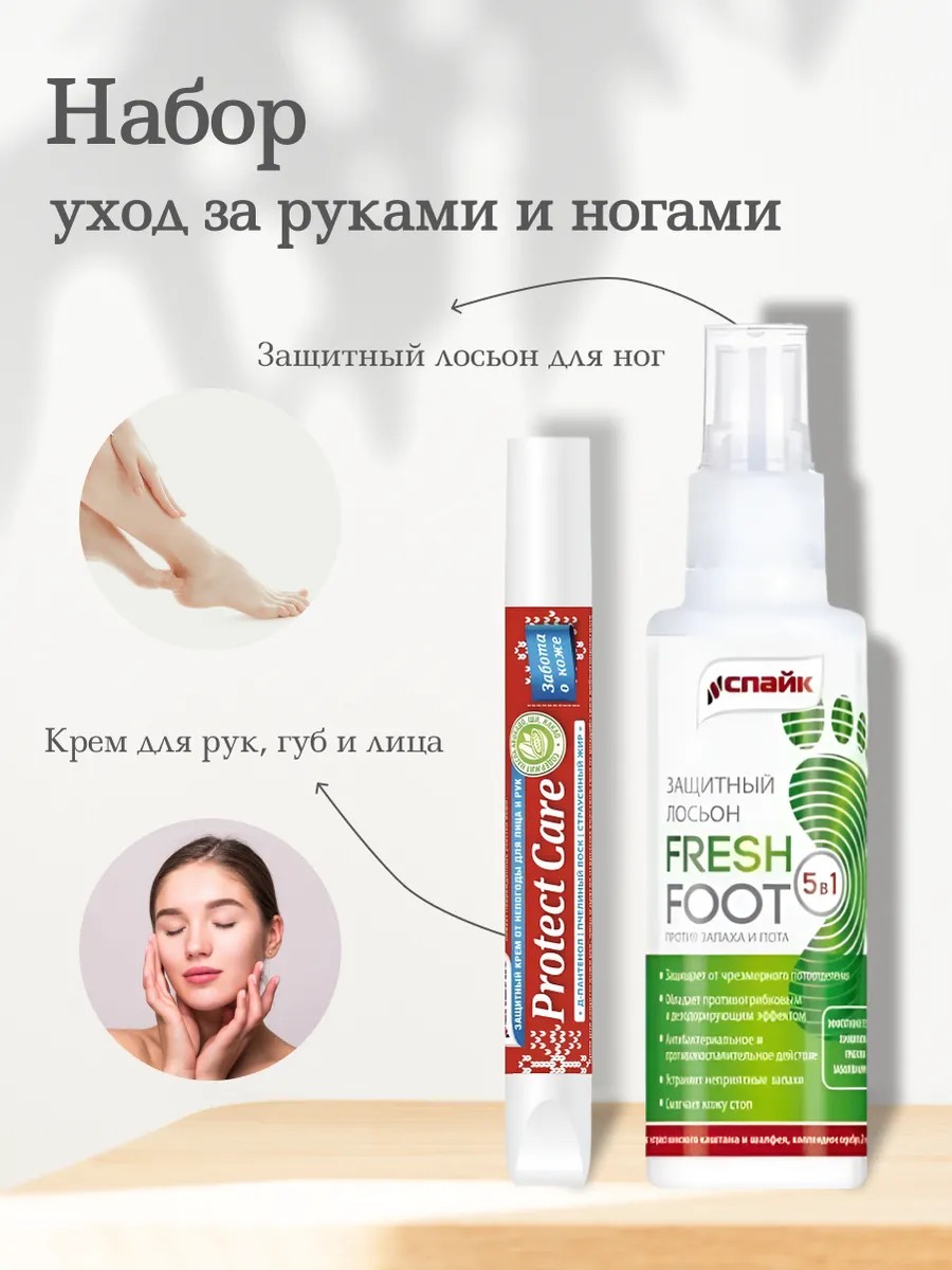 Представляем вам идеальный набор для ухода за руками и ногами СПАЙК! Этот набор станет незаменимым помощником в ежедневной заботе о вашей коже. В комплект входят спрей для ног от пота и запаха, а также питательный крем для рук.